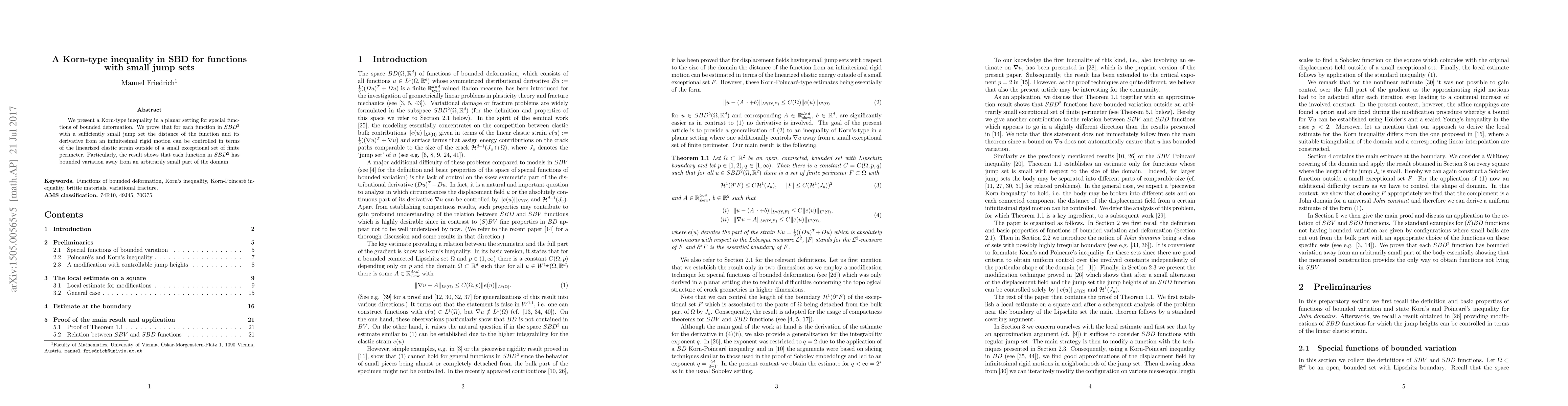 We present a Korn-type inequality in a planar setting for special functions of bounded deformation. We prove that for each function in SBD$^2$ with sufficiently small jump set the distance of the function and its derivative from an infinitesimal rigid motion can be controlled in terms of the linearized elastic strain outside of a small exceptional set of finite perimeter. Particularly the result shows that each function in SBD$^2$ has bounded variation away from an arbitrarily small part of the domain.