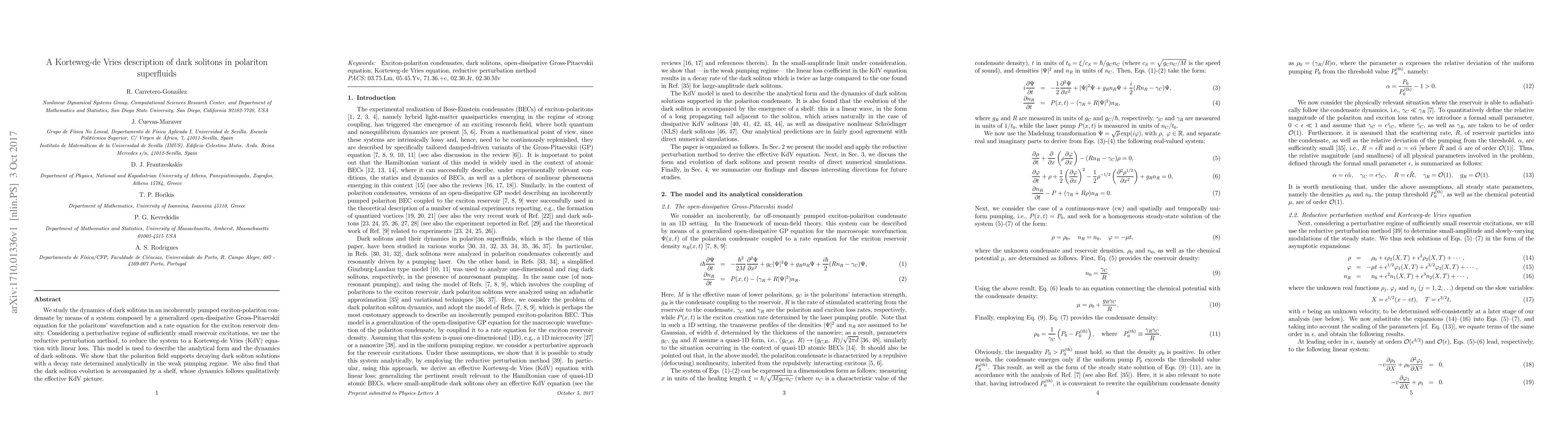 We study the dynamics of dark solitons in an incoherently pumped exciton-polariton condensate by means of a system composed by a generalized open-dissipative Gross-Pitaevskii equation for the polaritons' wavefunction and a rate equation for the exciton reservoir density. Considering a perturbative regime of sufficiently small reservoir excitations, we use the reductive perturbation method, to reduce the system to a Korteweg-de Vries (KdV) equation with linear loss. This model is used to describe the analytical form and the dynamics of dark solitons. We show that the polariton field supports decaying dark soliton solutions with a decay rate determined analytically in the weak pumping regime. We also find that the dark soliton evolution is accompanied by a shelf, whose dynamics follows qualitatively the effective KdV picture.