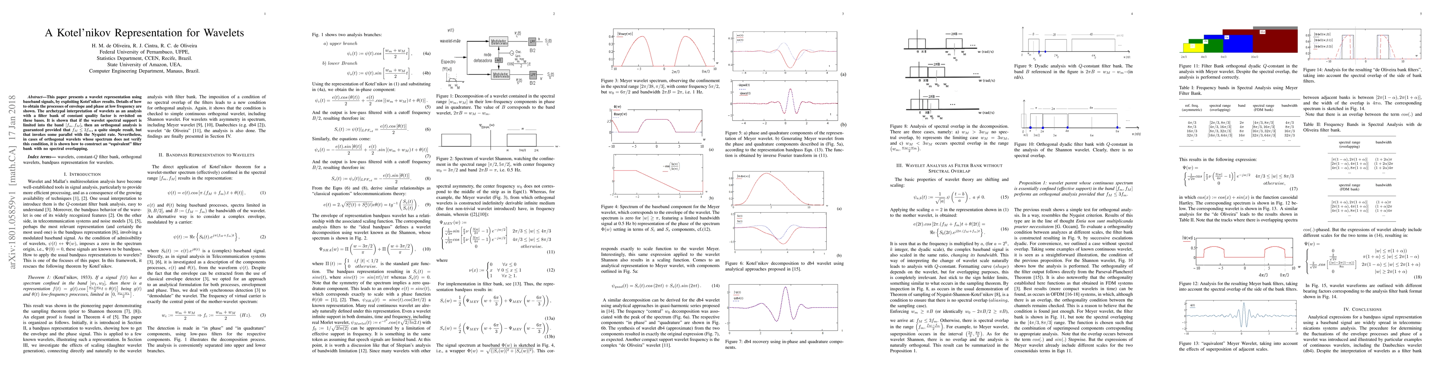 Researchers develop a new method for analyzing wavelets using Kotel'nikov representation, which guarantees orthogonal analysis when the wavelet spectral support is within a specific frequency range. The study also provides a solution for constructing an equivalent filter bank with no spectral overlapping in cases where this condition is not met.