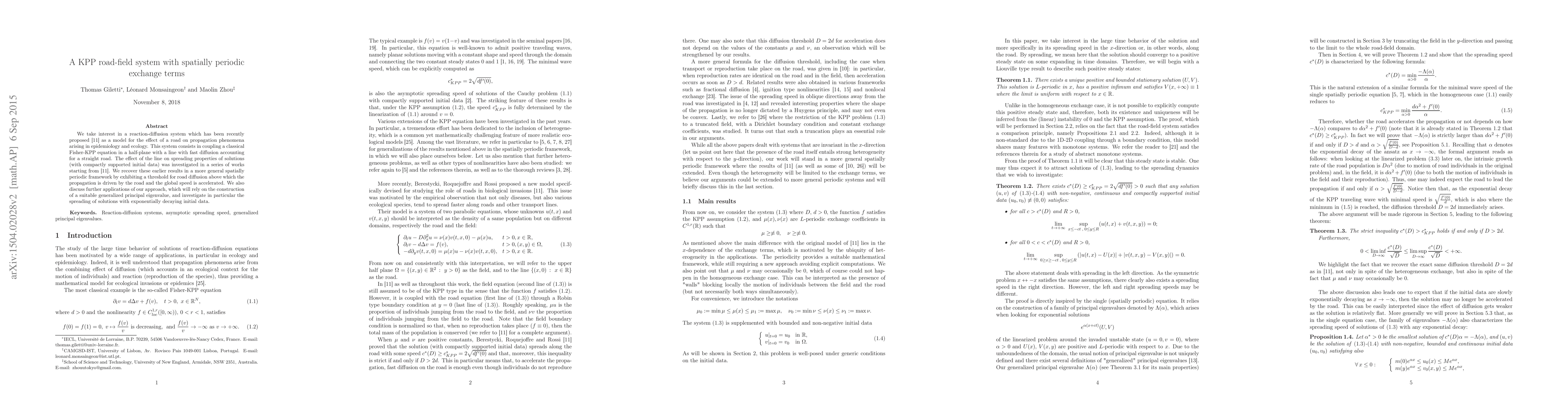 We take interest in a reaction-diffusion system which has been recently proposed [11] as a model for the effect of a road on propagation phenomena arising in epidemiology and ecology. This system consists in coupling a classical Fisher-KPP equation in a half-plane with a line with fast diffusion accounting for a straight road. The effect of the line on spreading properties of solutions (with compactly supported initial data) was investigated in a series of works starting from [11]. We recover these earlier results in a more general spatially periodic framework by exhibiting a threshold for road diffusion above which the propagation is driven by the road and the global speed is accelerated. We also discuss further applications of our approach, which will rely on the construction of a suitable generalized principal eigenvalue, and investigate in particular the spreading of solutions with exponentially decaying initial data.