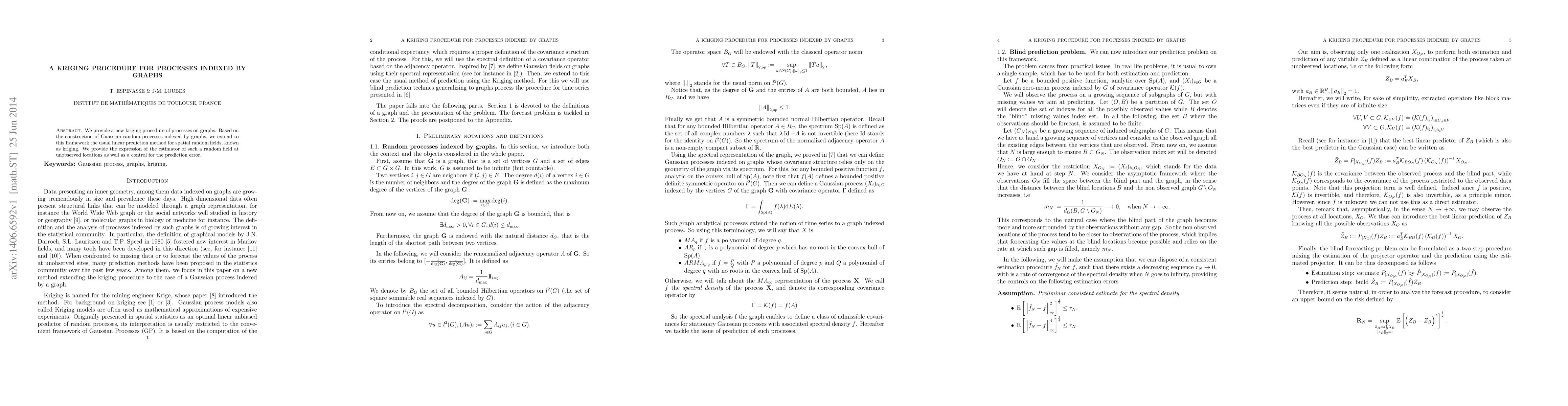We provide a new kriging procedure of processes on graphs. Based on the construction of Gaussian random processes indexed by graphs, we extend to this framework the usual linear prediction method for spatial random fields, known as kriging. We provide the expression of the estimator of such a random field at unobserved locations as well as a control for the prediction error.