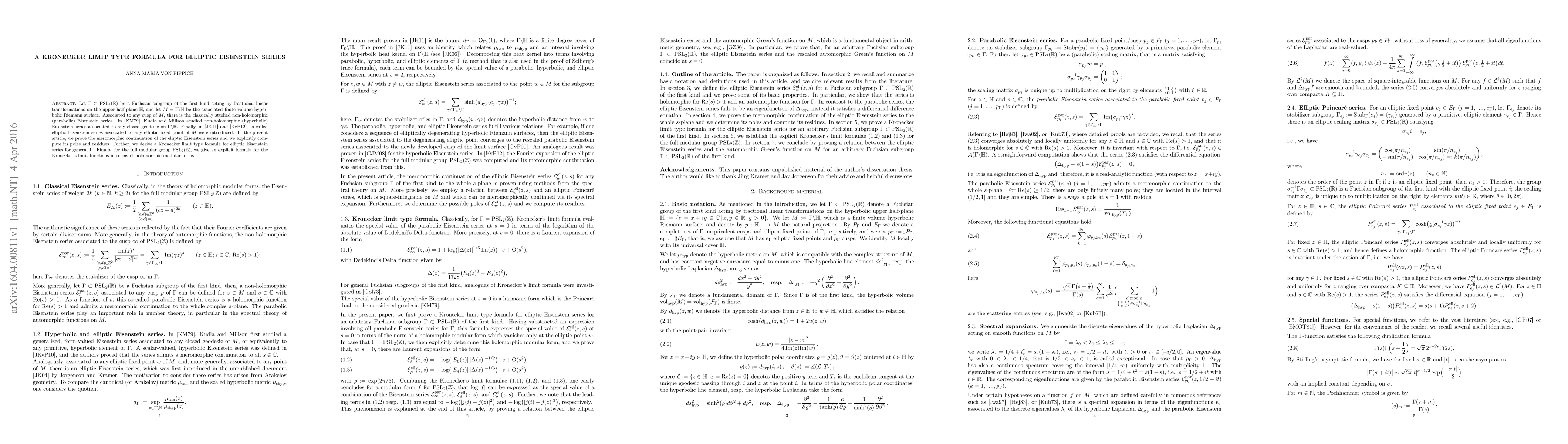 This paper proves the meromorphic continuation of elliptic Eisenstein series, computes their poles and residues, and derives a Kronecker limit type formula for these series associated with general Fuchsian subgroups. It also provides an explicit formula for Kronecker's limit functions in terms of holomorphic modular forms for the full modular group.