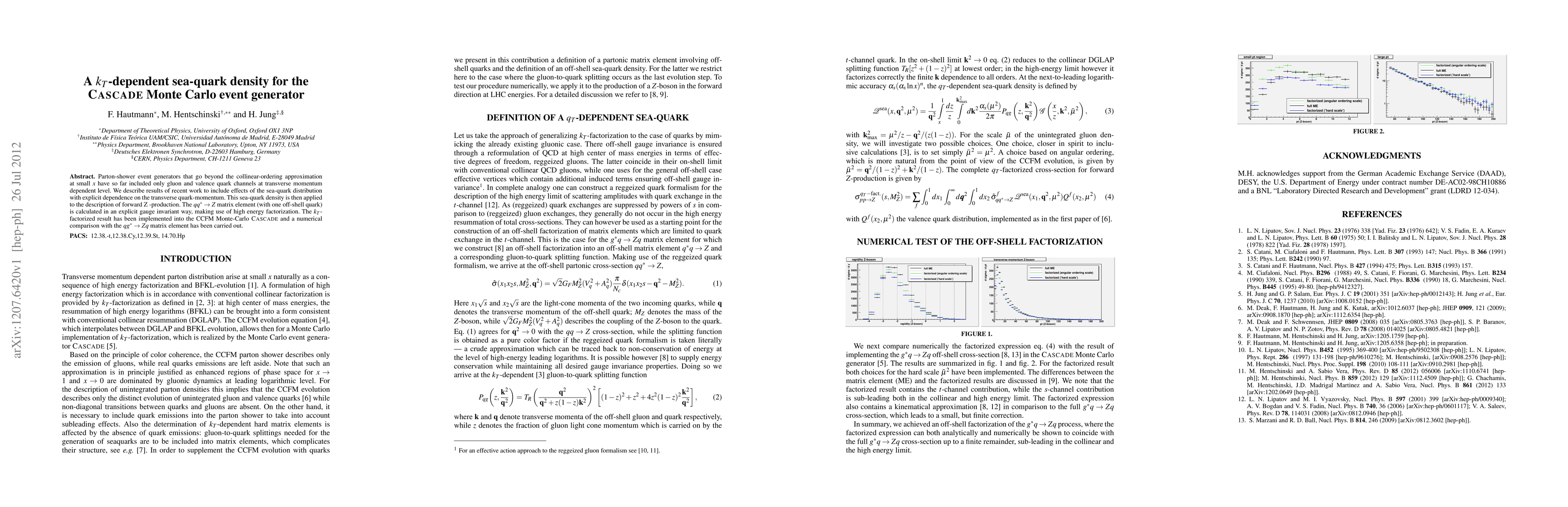 Parton-shower event generators that go beyond the collinear-ordering approximation at small x have so far included only gluon and valence quark channels at transverse momentum dependent level. We describe results of recent work to include effects of the sea-quark distribution with explicit dependence on the transverse quark-momentum.This sea-quark density is then applied to the description of forward Z -production. The qq*->Z matrix element (with one off-shell quark) is calculated in an explicit gauge invariant way, making use of high energy factorization. The kT-factorized result has been implemented into the CCFM Monte-Carlo CASCADE and a numerical comparison with the qg*->Zq matrix element has been carried out.