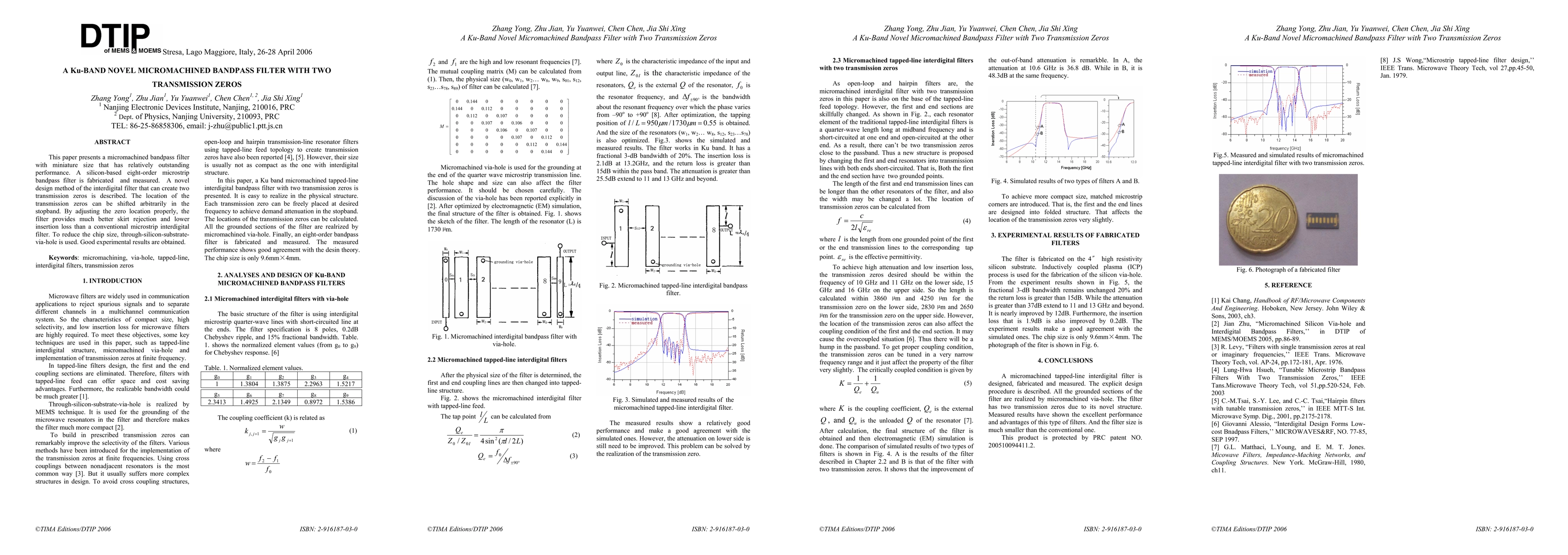 This paper introduces a compact Ku-Band micromachined bandpass filter with two transmission zeros, achieved via a novel interdigital design, enhancing skirt rejection and reducing insertion loss. The use of through-silicon-substrate-via-hole further minimizes chip size, with favorable experimental results.