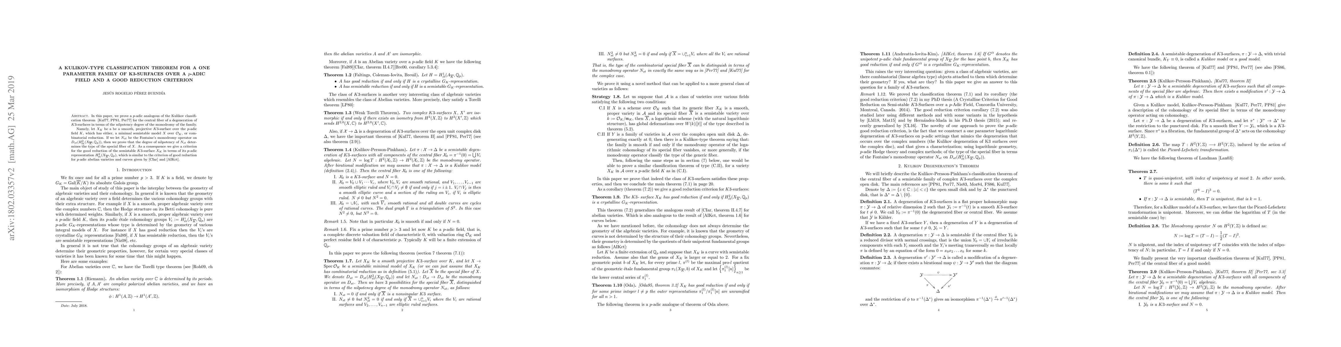 In this paper, we prove a $p$-adic analogous of the Kulikov-Persson-Pinkham classification theorem [Persson:1981wp] for the central fiber of a degeneration of $K3$-surfaces in terms of the nilpotency degree of the monodromy of the family. Namely, let $X_K$ be a be a smooth, projective $K3$-surface which has a minimal semi-stable model $X$ over $\mathcal O_K$. If we let $N_{st}$ be the monodromy operator on $D_{st}(H^2_{et}}(X_{\overline K},\mathbb Q_p))$, then we prove that the degree of nilpotency of $N_{st}$ determines the type of the special fiber of $X$. As a consequence we give a criterion for the good reduction of the semi-stable $K3$-surface $X_K$ over the $p$-adic field $K$ in terms of its $p$-adic representation $H^2_{\text{et}}(X_{\overline K},\mathbb Q_p)$, which is similar to the criterion of good reduction for $p$-adic abelian varieties and curves given by Coleman-Iovita and Andreatta-Iovita-Kim.
