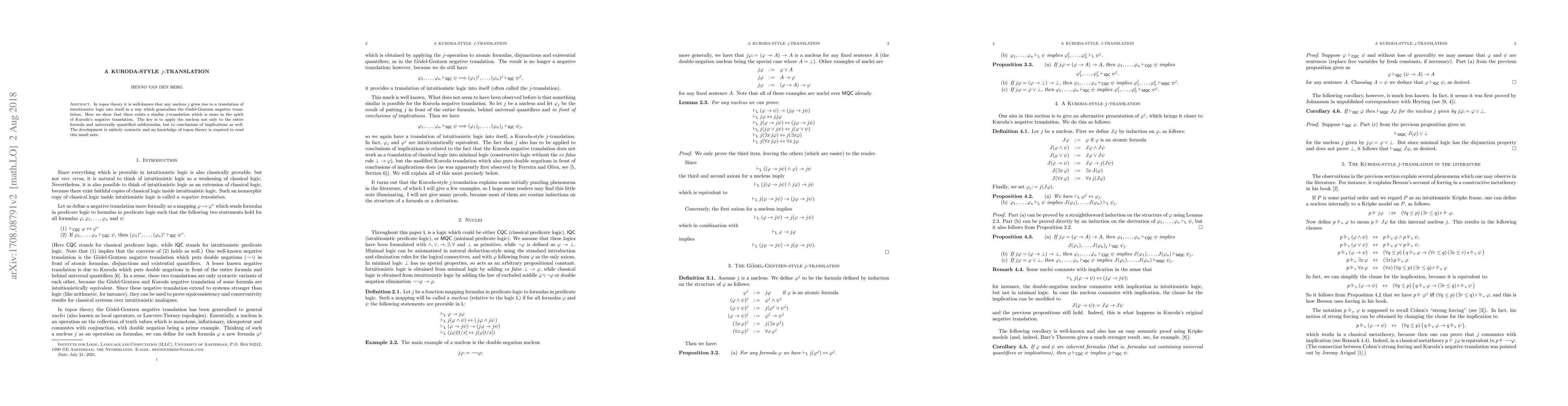 In topos theory it is well-known that any nucleus j gives rise to a translation of intuitionistic logic into itself in a way which generalises the Goedel-Gentzen negative translation. Here we show that there exists a similar j-translation which is more in the spirit of Kuroda's negative translation. The key is to apply the nucleus not only to the entire formula and universally quantified subformulas, but to conclusions of implications as well. The development is entirely syntactic and no knowledge of topos theory is required to read this small note.