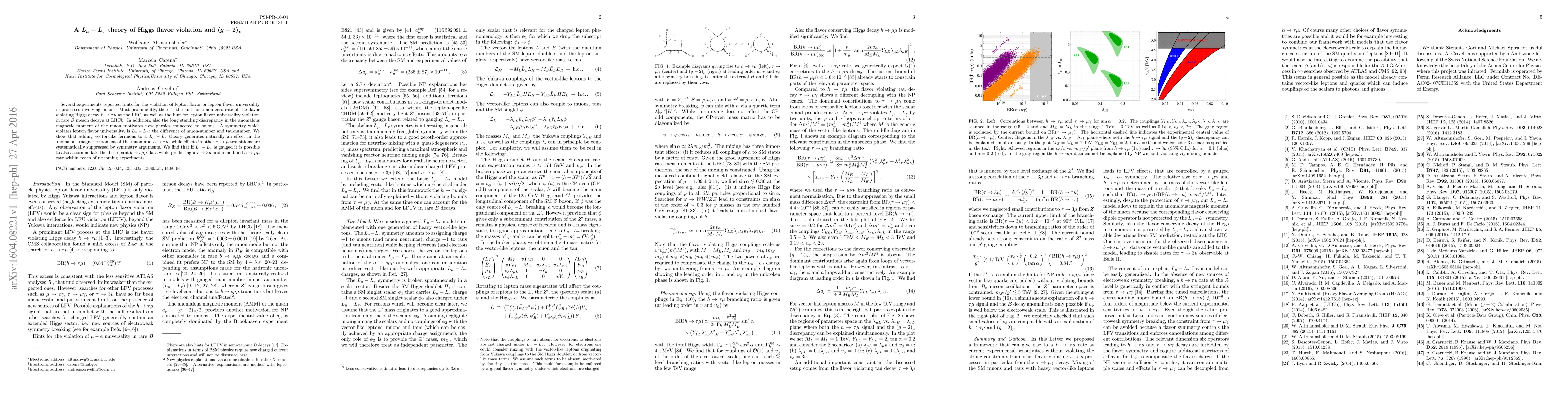 This paper explores a $L_\mu - L_\tau$ theory to explain hints of Higgs flavor violation and the discrepancy in the anomalous magnetic moment of the muon, suggesting vector-like fermions can naturally generate these effects while suppressing other flavor-changing processes. Gauging $L_\mu - L_\tau$ also accommodates rare $B$ meson decay anomalies.