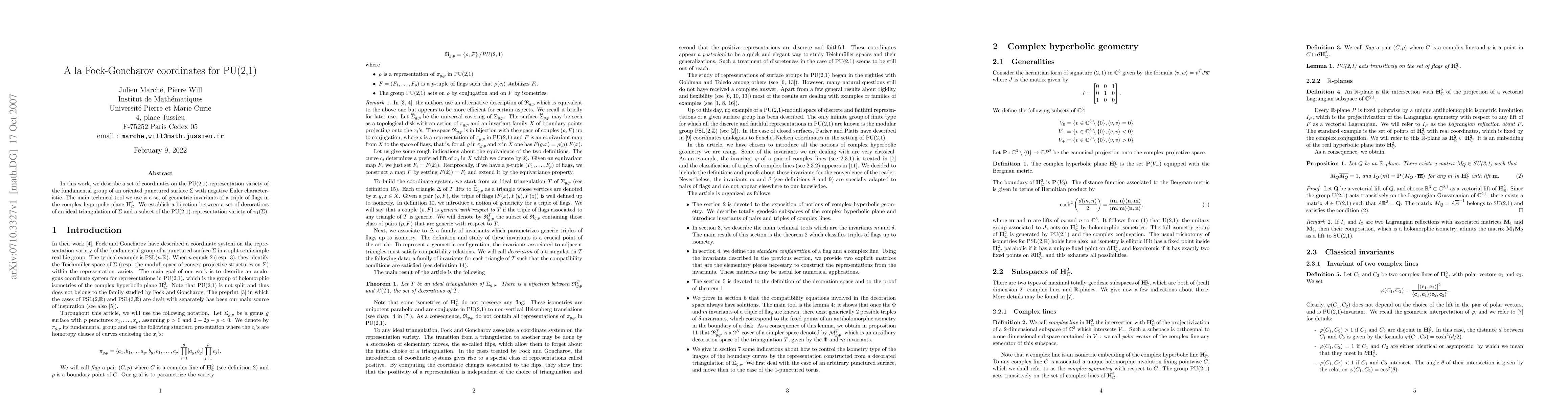 We describe a set of coordinates on the PU(2,1)-representation variety of the fundamental group of an oriented punctured surface $S$ with negative Euler characteristic. The main technical tool we use is a set of geometric invariants of a triple of flags in the complex hyperpolic plane. We establish a bijection between a set of decorations of an ideal triangulation of $S$ and a subset of the PU(2,1)-representation variety of $\pi_1(S)$.
