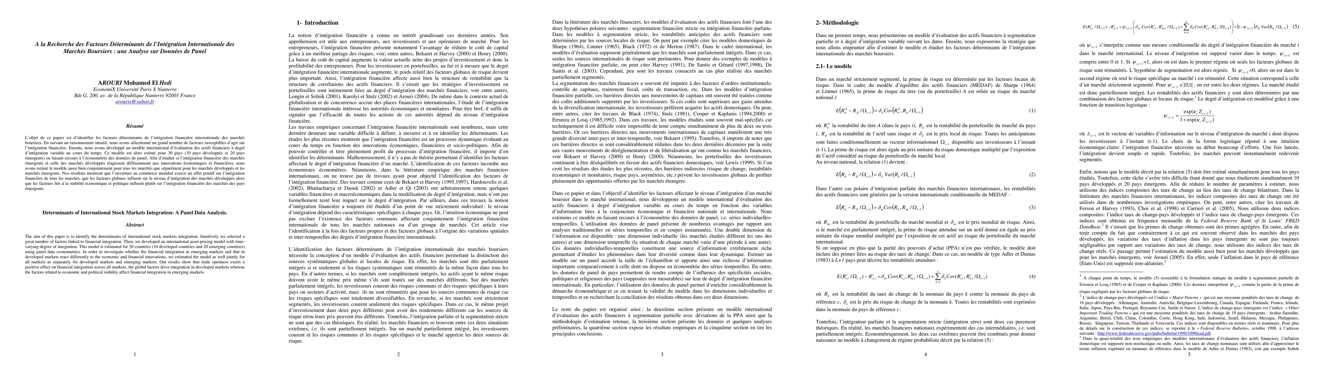 The aim of this paper is to identify the determinants of international stock markets integration. Intuitively we selected a great number of factors linked to financial integration. Then, we developed an international asset-pricing model with time-varying degree of integration. This model is estimated for 30 countries (10 developed countries and 20 emerging countries) using panel data econometrics. In order to investigate whether the financial integration in emerging markets and that in developed markets react differently to the economic and financial innovations, we estimated the model as well jointly for all markets as separately for developed markets and emerging markets. Our results show that trade openness exerts a positive effect on financial integration across all markets, the global factors drive integration in developed markets whereas the factors related to economic and political stability affect financial integration in emerging markets.