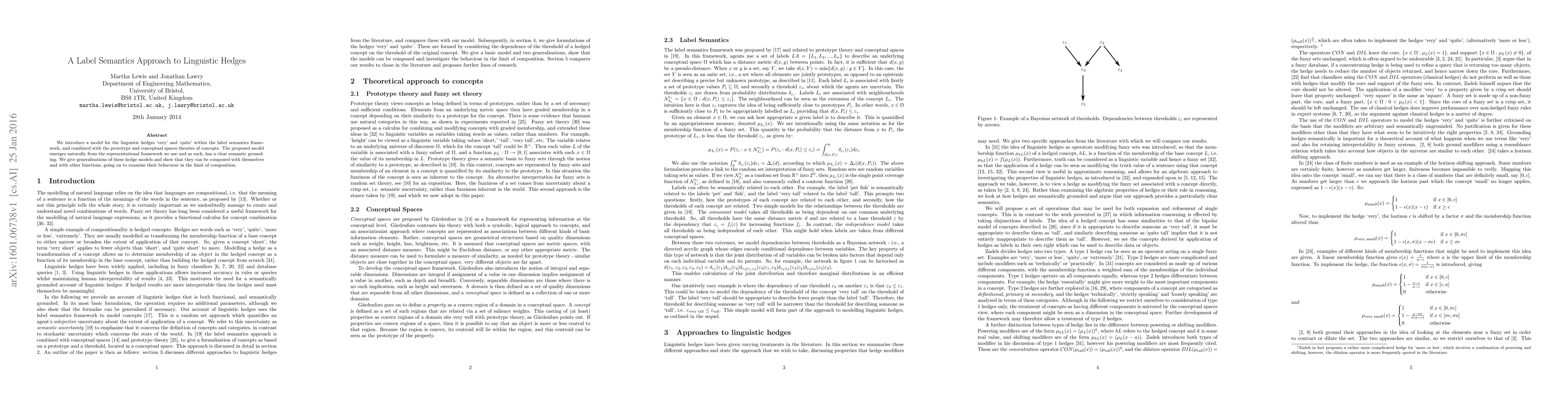 This research paper introduces a model for linguistic hedges 'very' and 'quite', combining label semantics with prototype and conceptual spaces theories. The proposed model has clear semantic grounding and can be composed with other functions, providing insights into its behavior.