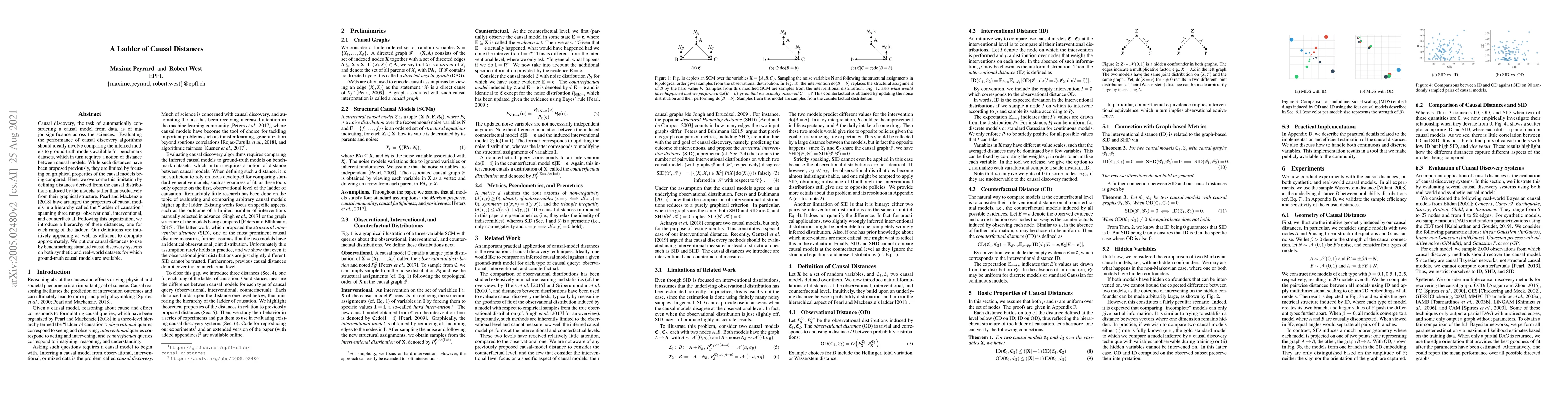 Causal discovery, the task of automatically constructing a causal model from data, is of major significance across the sciences. Evaluating the performance of causal discovery algorithms should ideally involve comparing the inferred models to ground-truth models available for benchmark datasets, which in turn requires a notion of distance between causal models. While such distances have been proposed previously, they are limited by focusing on graphical properties of the causal models being compared. Here, we overcome this limitation by defining distances derived from the causal distributions induced by the models, rather than exclusively from their graphical structure. Pearl and Mackenzie (2018) have arranged the properties of causal models in a hierarchy called the "ladder of causation" spanning three rungs: observational, interventional, and counterfactual. Following this organization, we introduce a hierarchy of three distances, one for each rung of the ladder. Our definitions are intuitively appealing as well as efficient to compute approximately. We put our causal distances to use by benchmarking standard causal discovery systems on both synthetic and real-world datasets for which ground-truth causal models are available. Finally, we highlight the usefulness of our causal distances by briefly discussing further applications beyond the evaluation of causal discovery techniques.