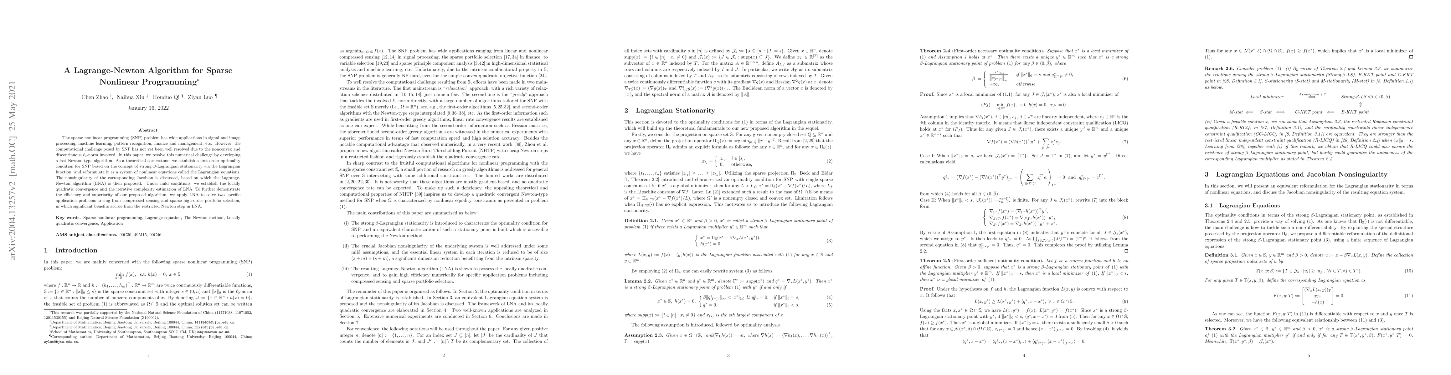 A new algorithm, Lagrange-Newton Algorithm (LNA), is proposed to solve sparse nonlinear programming problems, resolving the computational challenge posed by nonconvex $ell_0$-norm, with locally quadratic convergence and efficiency demonstrated on two application problems.