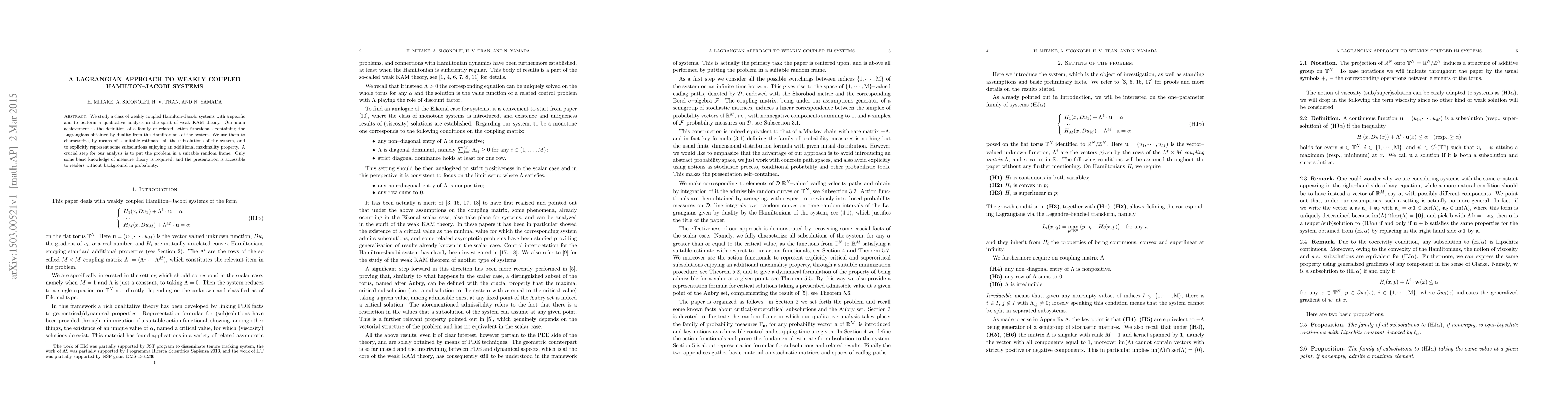 We study a class of weakly coupled Hamilton-Jacobi systems with a specific aim to perform a qualitative analysis in the spirit of weak KAM theory. Our main achievement is the definition of a family of related action functionals containing the Lagrangians obtained by duality from the Hamiltonians of the system. We use them to characterize, by means of a suitable estimate, all the subsolutions of the system, and to explicitly represent some subsolutions enjoying an additional maximality property. A crucial step for our analysis is to put the problem in a suitable random frame. Only some basic knowledge of measure theory is required, and the presentation is accessible to readers without background in probability.