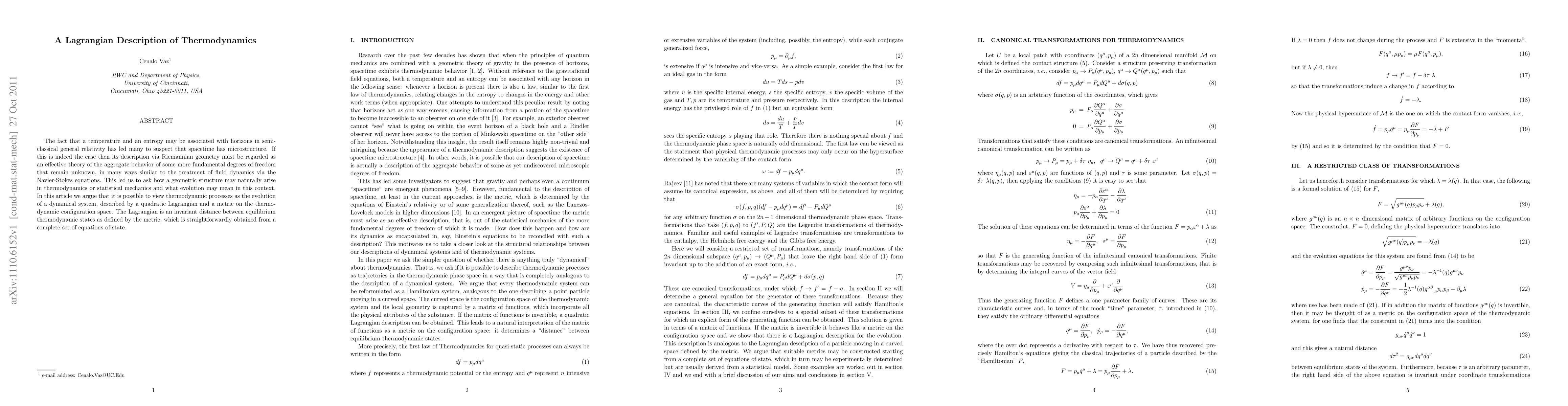 This paper proposes a novel perspective on thermodynamics, suggesting it can be viewed as the evolution of a dynamical system. It introduces a quadratic Lagrangian and a metric on thermodynamic configuration space, defining the Lagrangian as an invariant distance between equilibrium thermodynamic states derived from equations of state.