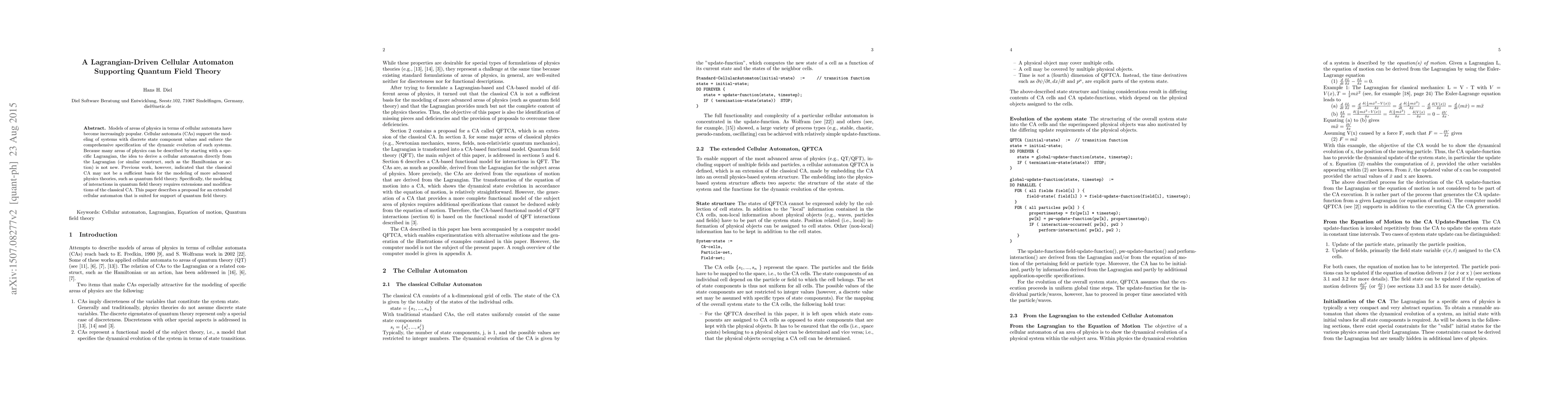 This paper proposes an extended cellular automaton derived from a Lagrangian to model quantum field theory, addressing limitations of classical CAs in representing advanced physics interactions. The new model aims to provide a suitable framework for quantum field theory simulations.