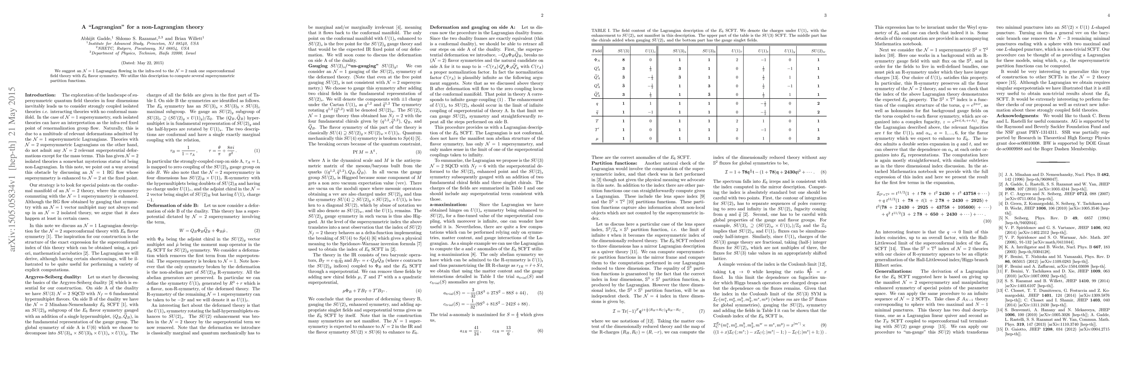 This paper proposes an N=1 Lagrangian that asymptotically matches an N=2 superconformal field theory in the infrared, leveraging this approach to calculate various supersymmetric partition functions. The focus is on the E_6 flavor symmetry within the theoretical framework.