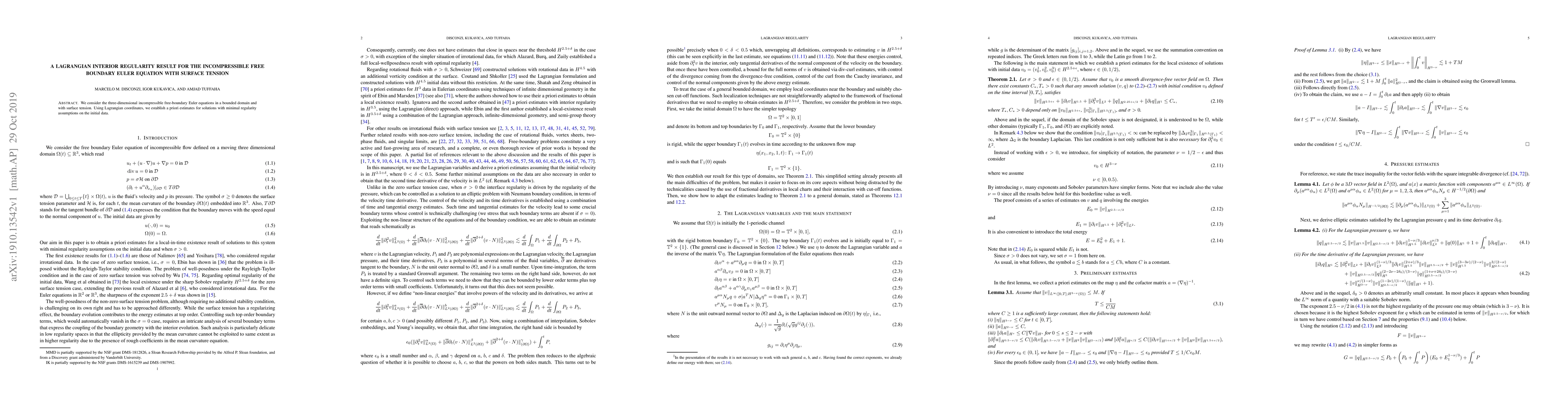 Summary: This paper establishes Lagrangian interior regularity results for the three-dimensional incompressible free-boundary Euler equations with surface tension, providing a priori estimates for solutions under minimal initial data regularity conditions.