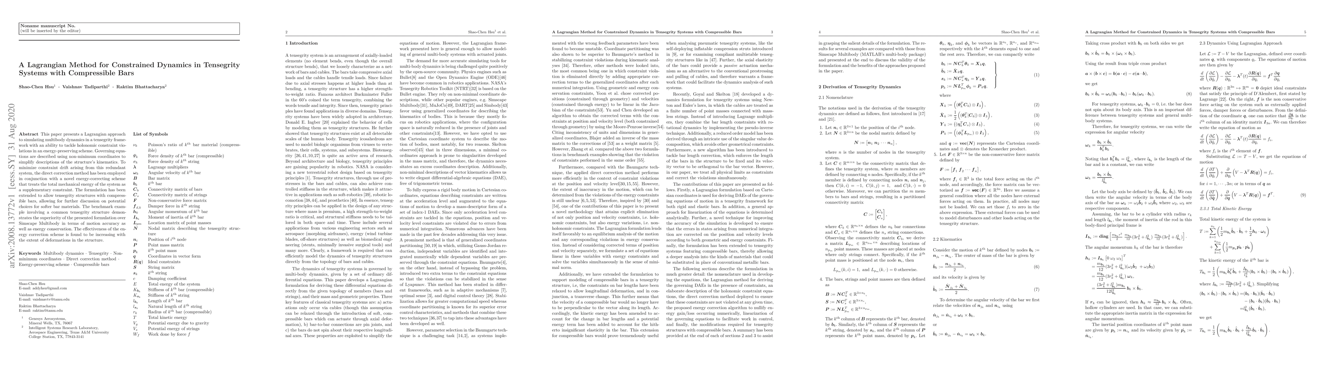 This paper introduces a Lagrangian method for simulating constrained dynamics in tensegrity systems with compressible bars, employing a direct correction method and energy-correcting scheme to maintain energy conservation and minimize constraint drift. The proposed approach outperforms Simscape Multibody in accuracy and energy preservation, especially under significant structural deformations.