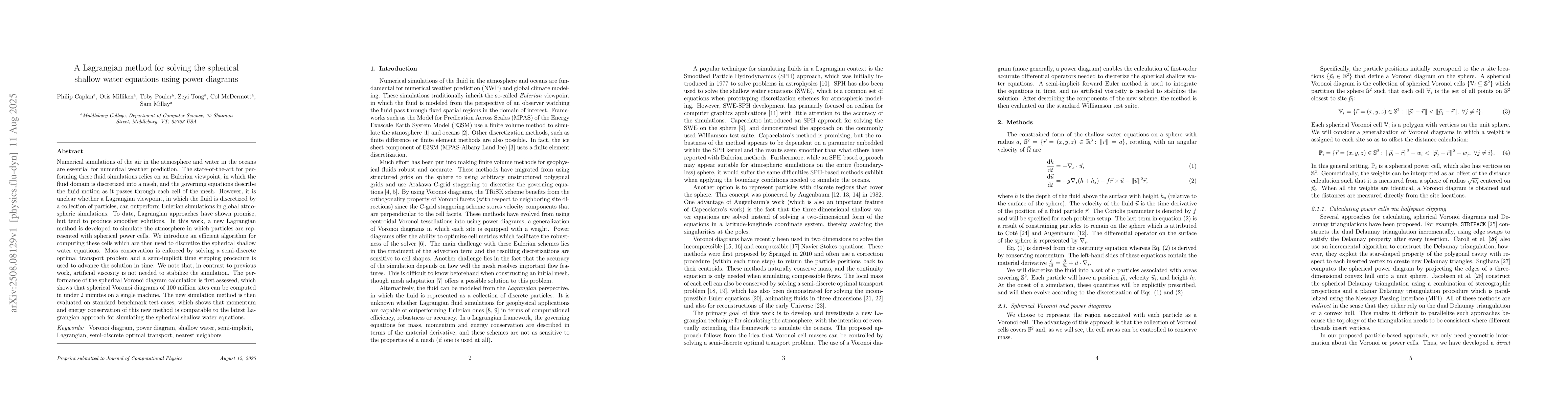 The paper presents an efficient algorithm for computing spherical power diagrams and integrating them into a semi-implicit Lagrangian framework for shallow water equations.