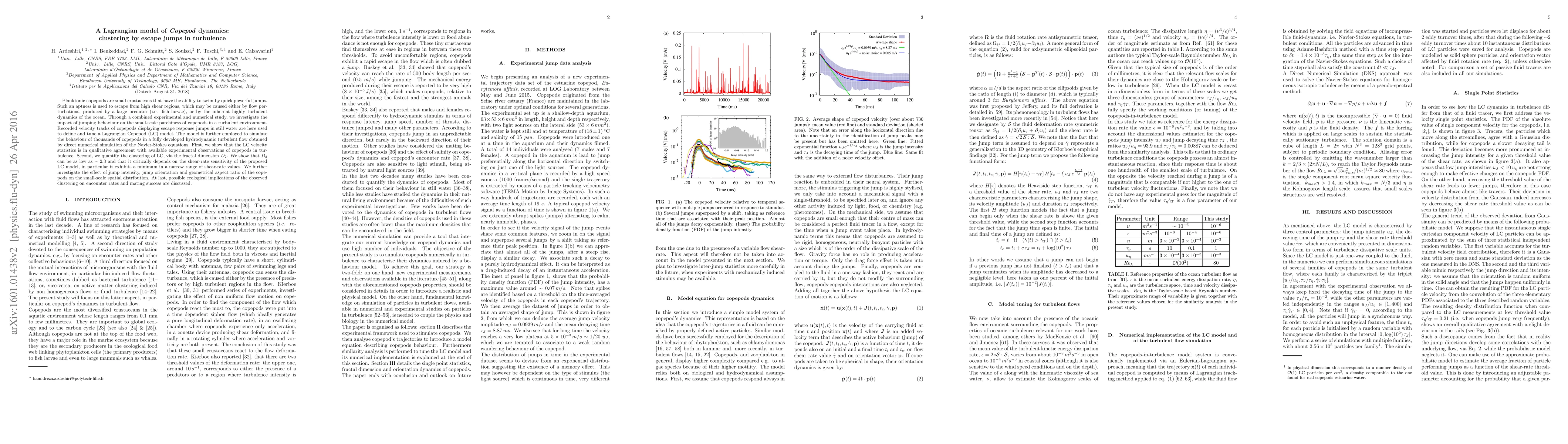 Planktonic copepods are small crustaceans that have the ability to swim by quick powerful jumps. Such an aptness is used to escape from high shear regions, which may be caused either by flow per- turbations, produced by a large predator (i.e., fish larvae), or by the inherent highly turbulent dynamics of the ocean. Through a combined experimental and numerical study, we investigate the impact of jumping behaviour on the small-scale patchiness of copepods in a turbulent environment. Recorded velocity tracks of copepods displaying escape response jumps in still water are here used to define and tune a Lagrangian Copepod (LC) model. The model is further employed to simulate the behaviour of thousands of copepods in a fully developed hydrodynamic turbulent flow obtained by direct numerical simulation of the Navier-Stokes equations. First, we show that the LC velocity statistics is in qualitative agreement with available experimental observations of copepods in tur- bulence. Second, we quantify the clustering of LC, via the fractal dimension $D_2$. We show that $D_2$ can be as low as ~ 2.3 and that it critically depends on the shear-rate sensitivity of the proposed LC model, in particular it exhibits a minimum in a narrow range of shear-rate values. We further investigate the effect of jump intensity, jump orientation and geometrical aspect ratio of the copepods on the small-scale spatial distribution. At last, possible ecological implications of the observed clustering on encounter rates and mating success are discussed