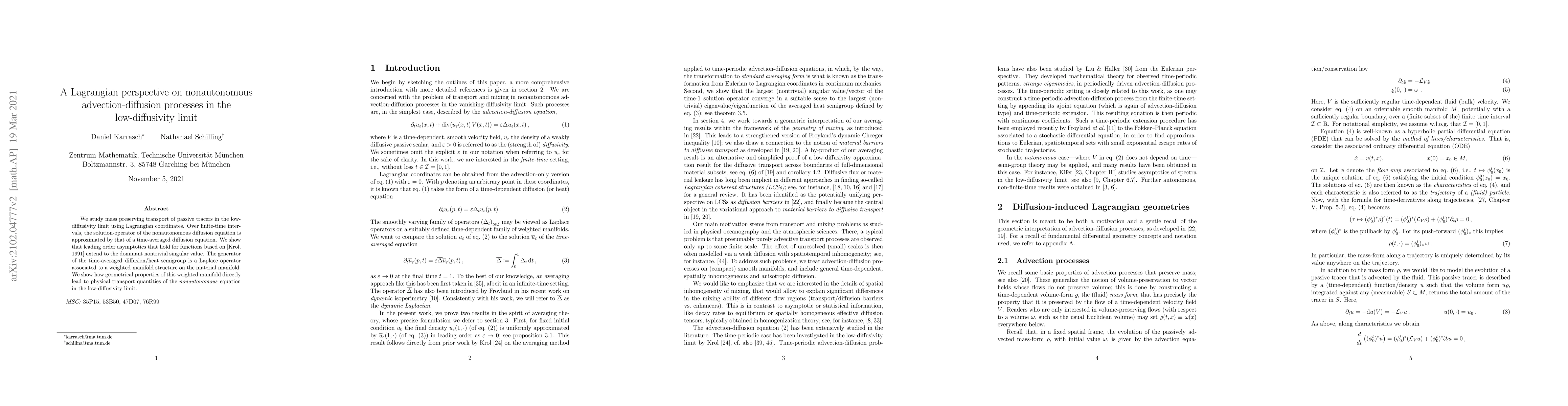 We study mass preserving transport of passive tracers in the low-diffusivity limit using Lagrangian coordinates. Over finite-time intervals, the solution-operator of the nonautonomous diffusion equation is approximated by that of a time-averaged diffusion equation. We show that leading order asymptotics that hold for functions [Krol, 1991] extend to the dominant nontrivial singular value. This answers questions raised in [Karrasch & Keller, 2020]. The generator of the time-averaged diffusion/heat semigroup is a Laplace operator associated to a weighted manifold structure on the material manifold. We show how geometrical properties of this weighted manifold directly lead to physical transport quantities of the nonautonomous equation in the low-diffusivity limit.