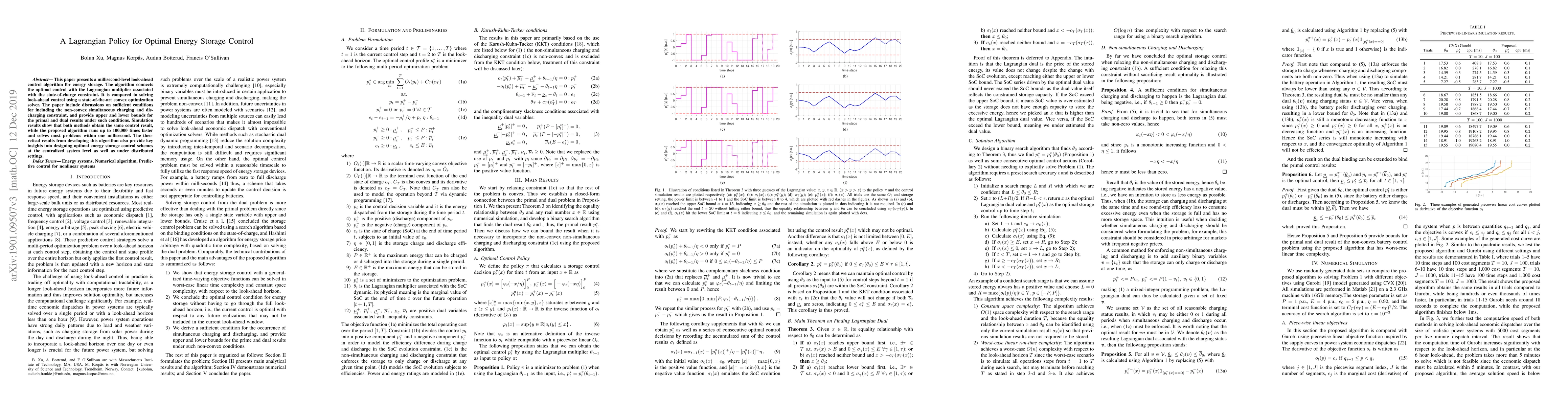 This paper presents a millisecond-level look-ahead control algorithm for energy storage with constant space complexity and worst-case linear run-time complexity. The algorithm connects the optimal control with the Lagrangian multiplier associated with the state-of-charge constraint. It is compared to solving look-ahead control using a state-of-the-art convex optimization solver. Simulation results show that both methods obtain the same control result, while the proposed algorithm runs up to 100,000 times faster and solves most problems within one millisecond. The theoretical results from developing this algorithm also provide key insights into designing optimal energy storage control schemes at the centralized system level as well as under distributed settings.
