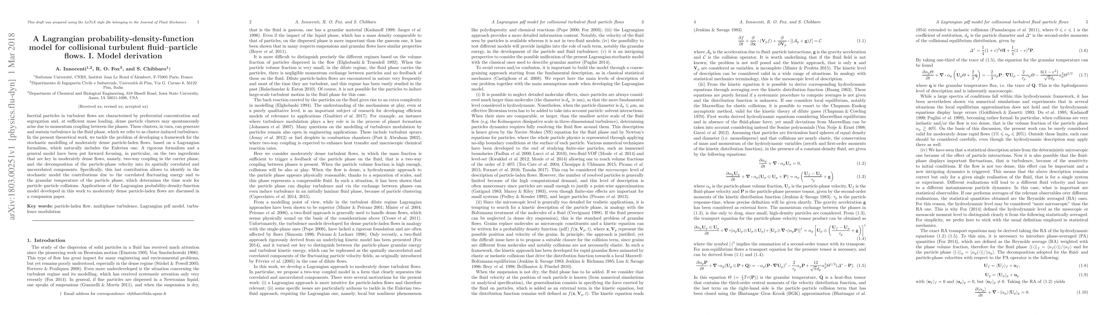 This paper develops a Lagrangian probability-density-function model for simulating moderately dense turbulent fluid-particle flows, focusing on two-way coupling and decomposing particle-phase velocity into correlated and uncorrelated components. The model identifies contributions from fluctuating energy and granular temperature, which are crucial for understanding particle-particle collisions.