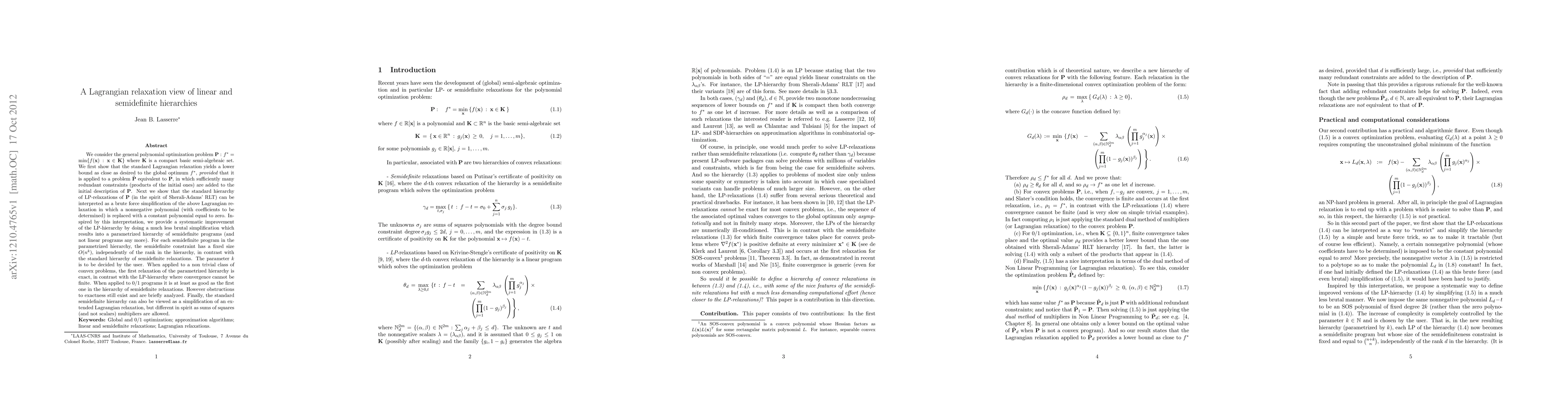 This paper explores Lagrangian relaxation techniques for polynomial optimization problems, demonstrating that adding redundant constraints improves lower bound accuracy. It introduces a parametrized hierarchy of semidefinite programs, which simplifies the standard LP-hierarchy, offering better performance for convex problems and at least equal performance for 0/1 programs.