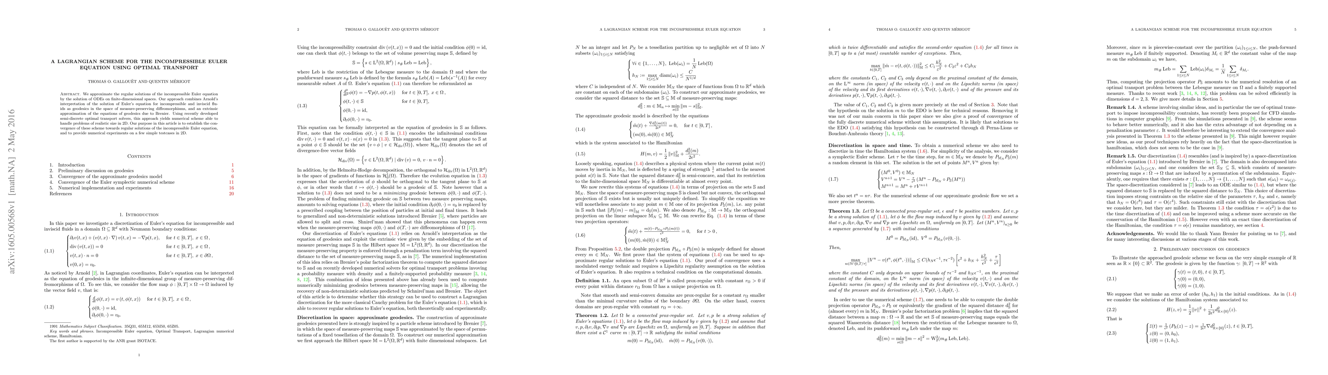 This paper proposes a Lagrangian scheme for solving the incompressible Euler equation by approximating solutions via optimal transport on finite-dimensional spaces. The method leverages Arnold's geodesic interpretation and Brenier's equations, achieving convergence and demonstrating feasibility through numerical experiments in 2D.