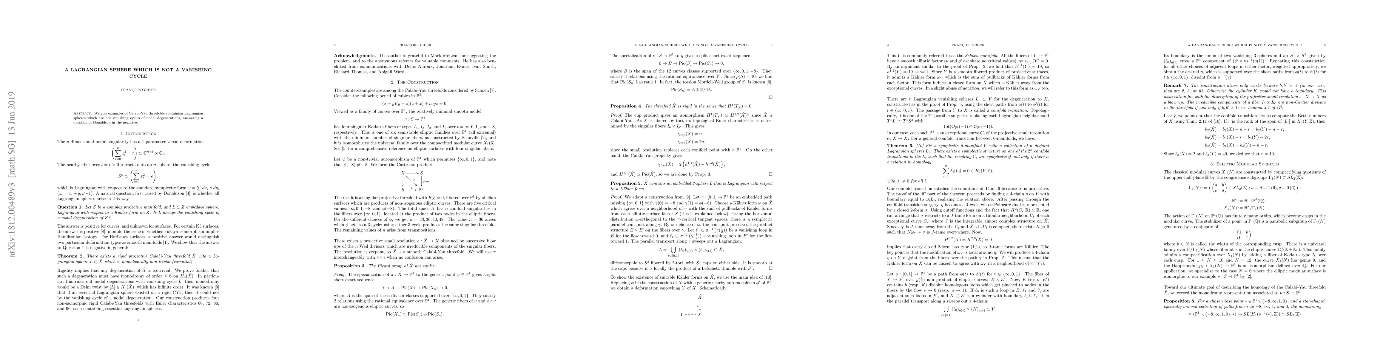 We give examples of Calabi-Yau threefolds containing Lagrangian spheres which are not vanishing cycles of nodal degenerations, answering a question of Donaldson in the negative.