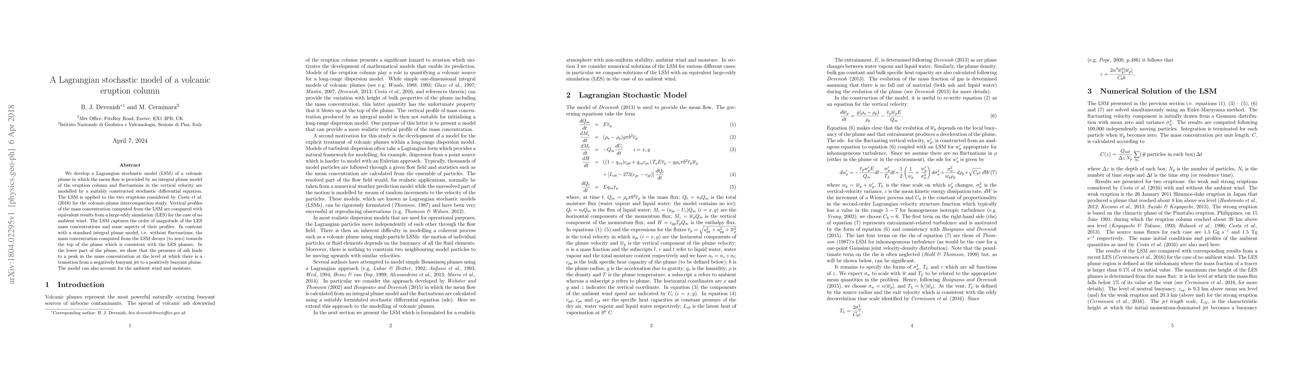 We develop a Lagrangian stochastic model (LSM) of a volcanic plume in which the mean flow is provided by an integral plume model of the eruption column and fluctuations in the vertical velocity are modelled by a suitably constructed stochastic differential equation. The LSM is applied to the two eruptions considered by Costa et al. (2016) for the volcanic-plume intercomparison study. Vertical profiles of the mass concentration computed from the LSM are compared with equivalent results from a large-eddy simulation (LES) for the case of no ambient wind. The LSM captures the order of magnitude of the LES mass concentrations and some aspects of their profiles. In contrast with a standard integral plume model, i.e. without fluctuations, the mass concentration computed from the LSM decays (to zero) towards the top of the plume which is consistent with the LES plumes. In the lower part of the plume, we show that the presence of ash leads to a peak in the mass concentration at the level at which there is a transition from a negatively buoyant jet to a positively buoyant plume. The model can also account for the ambient wind and moisture.
