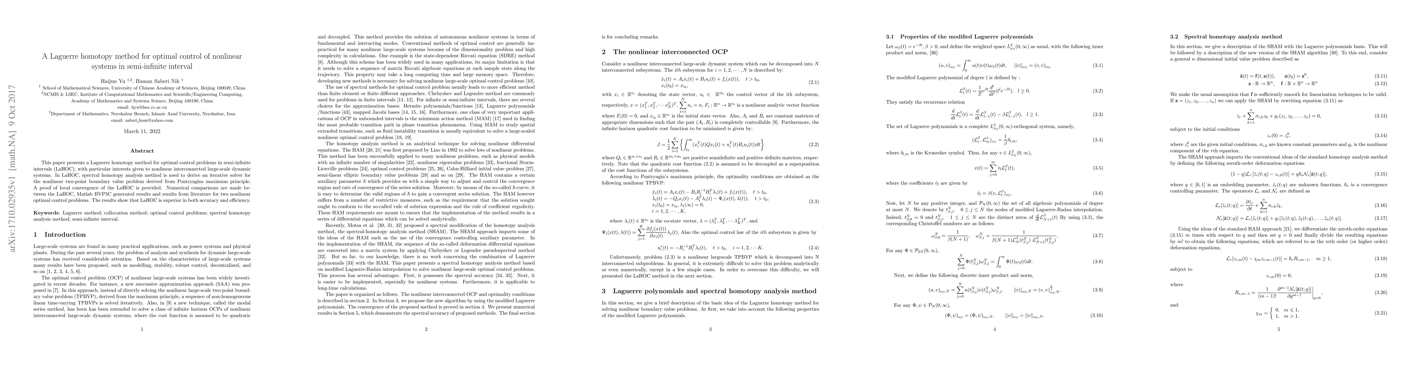 This paper presents a Laguerre homotopy method for optimal control problems in semi-infinite intervals (LaHOC), with particular interests given to nonlinear interconnected large-scale dynamic systems. In LaHOC, spectral homotopy analysis method is used to derive an iterative solver for the nonlinear two-point boundary value problem derived from Pontryagins maximum principle. A proof of local convergence of the LaHOC is provided. Numerical comparisons are made between the LaHOC, Matlab BVP5C generated results and results from literature for two nonlinear optimal control problems. The results show that LaHOC is superior in both accuracy and efficiency.