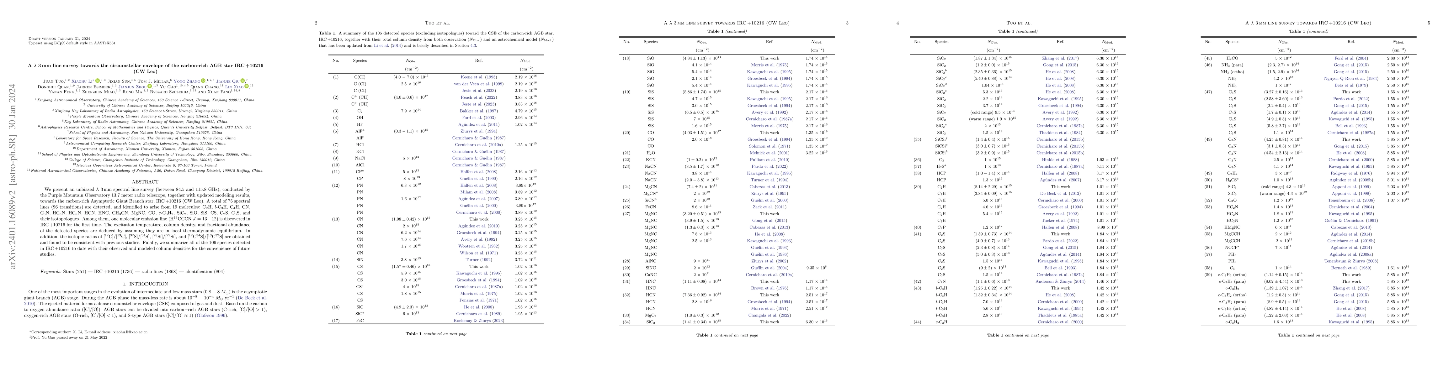 This study presents a comprehensive 3 mm line survey of the carbon-rich AGB star IRC+10216, detecting 75 spectral lines from 19 molecules, including the first detection of H$^{13}$CCCN. The survey identifies isotopic ratios consistent with previous studies and compiles data for 106 species detected in the star to date.