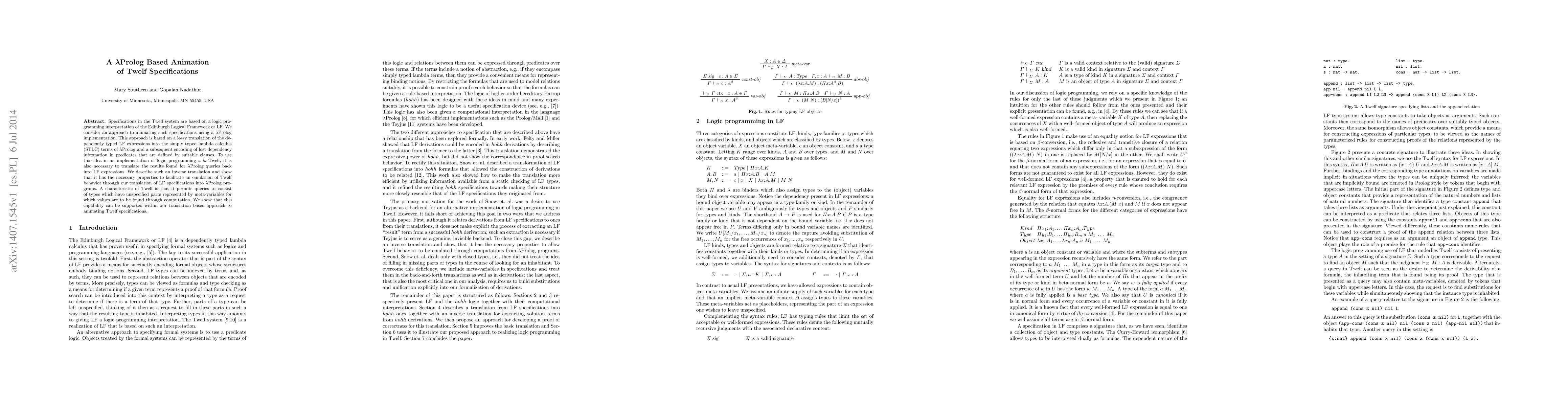 This paper presents a method for animating Twelf specifications using a Lambda Prolog implementation through a lossy translation of dependently typed expressions into lambda calculus terms, followed by an inverse translation to recover necessary information for Twelf emulation, supporting queries with meta-variables.