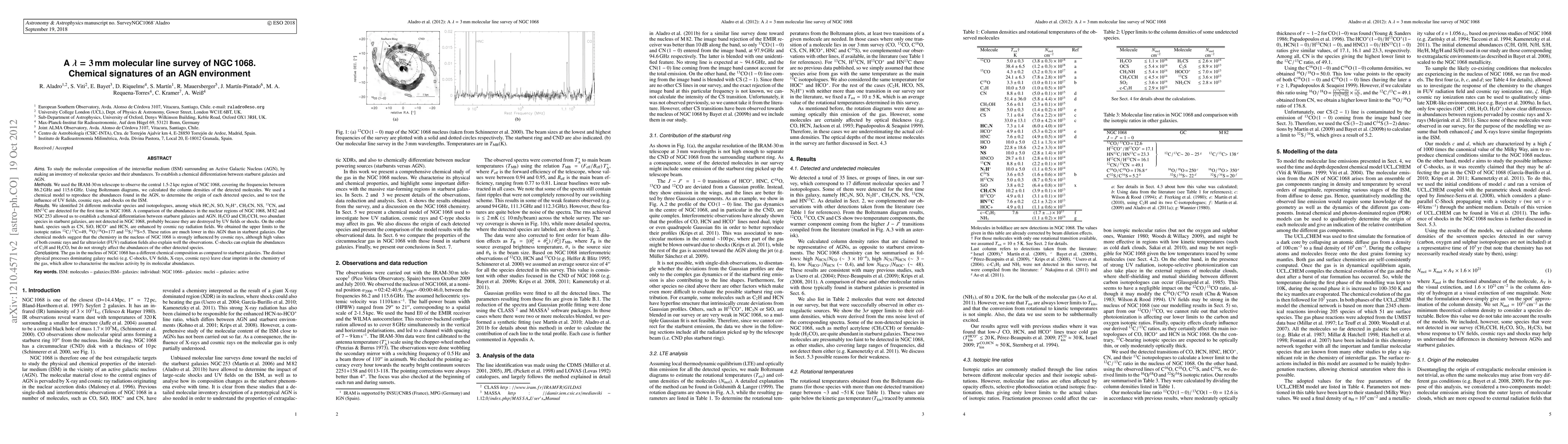 We aimed to study the molecular composition of the interstellar medium (ISM) surrounding an Active Galactic Nucleus (AGN), by making an inventory of molecular species and their abundances, as well as to establish a chemical differentiation between starburst galaxies and AGN. We used the IRAM-30 m telescope to observe the central 1.5-2 kpc region of NGC1068, covering the frequencies between 86.2 GHz and 115.6 GHz. Using Boltzmann diagrams, we calculated the column densities of the detected molecules. We used a chemical model to reproduce the abundances found in the AGN, to determine the origin of each detected species, and to test the influence of UV fields, cosmic rays, and shocks on the ISM. We identified 24 different molecular species and isotopologues, among which HC3N, SO, N2H+, CH3CN, NS, 13CN, and HN13C are detected for the first time in NGC1068. We obtained the upper limits to the isotopic ratios 12C/13C=49, 16O/18O=177 and 32S/34S=5. Our chemical models suggest that the chemistry in the nucleus of NGC1068 is strongly influenced by cosmic rays, although high values of both cosmic rays and far ultraviolet (FUV) radiation fields also explain well the observations. The gas in the nucleus of NGC1068 has a different chemical composition as compared to starburst galaxies. The distinct physical processes dominating galaxy nuclei (e.g. C-shocks, UV fields, X-rays, cosmic rays) leave clear imprints in the chemistry of the gas, which allow to characterise the nucleus activity by its molecular abundances.