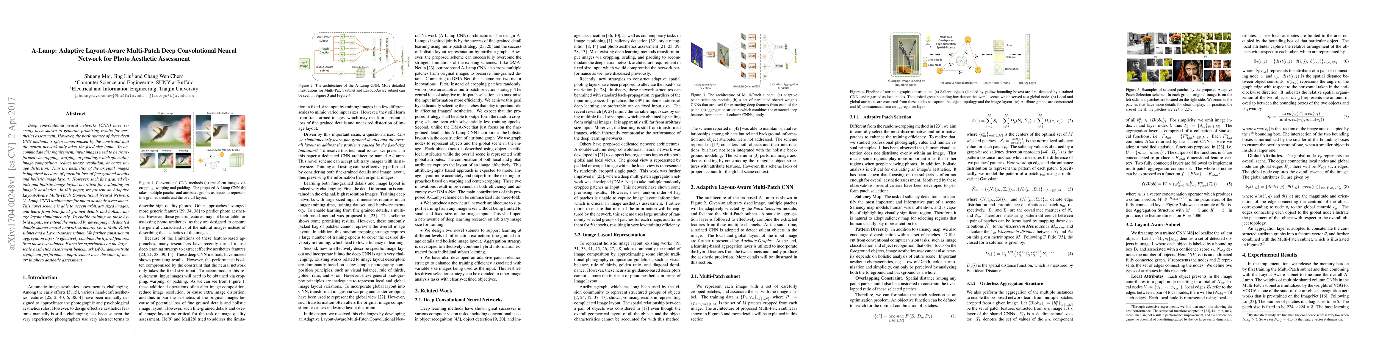 This paper introduces an Adaptive Layout-Aware Multi-Patch Convolutional Neural Network (A-Lamp CNN) for assessing photo aesthetics. Unlike traditional CNNs, A-Lamp CNN can handle images of any size without cropping or distortion, capturing both fine-grained details and holistic layout. The architecture includes a Multi-Patch subnet and a Layout-Aware subnet, combined via an aggregation layer, and shows superior performance on the AVA benchmark.