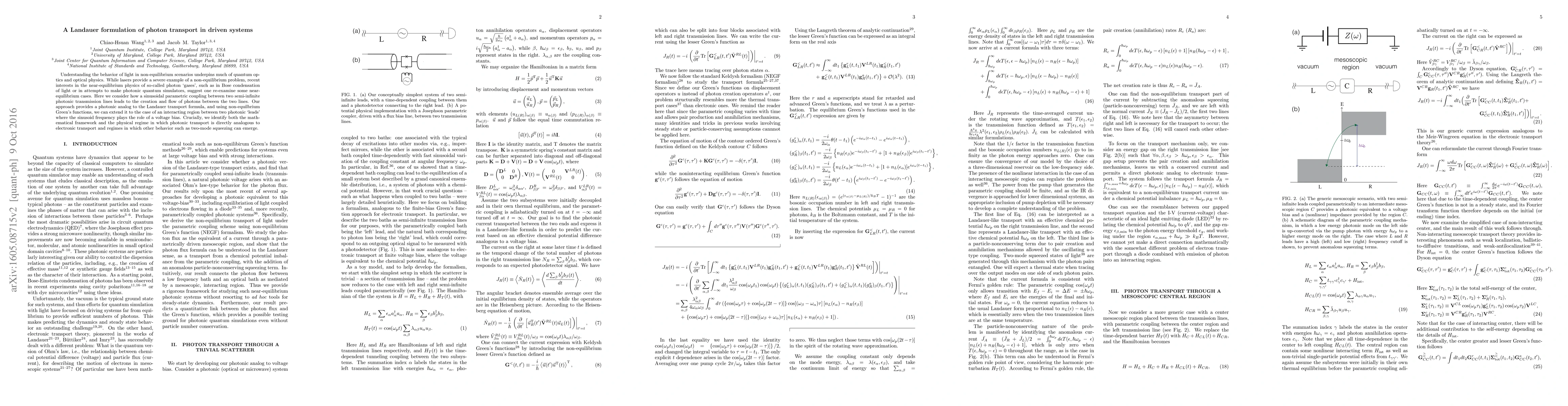 Understanding the behavior of light in non-equilibrium scenarios underpins much of quantum optics and optical physics. While lasers provide a severe example of a non-equilibrium problem, recent interests in the near-equilibrium physics of so-called photon `gases', such as in Bose condensation of light or in attempts to make photonic quantum simulators, suggest one re-examine some near-equilibrium cases. Here we consider how a sinusoidal parametric coupling between two semi-infinite photonic transmission lines leads to the creation and flow of photons between the two lines. Our approach provides a photonic analog to the Landauer transport formula, and using non-equilbrium Green's functions, we can extend it to the case of an interacting region between two photonic `leads' where the sinusoid frequency plays the role of a voltage bias. Crucially, we identify both the mathematical framework and the physical regime in which photonic transport is directly analogous to electronic transport and regimes in which other behavior such as two-mode squeezing can emerge.