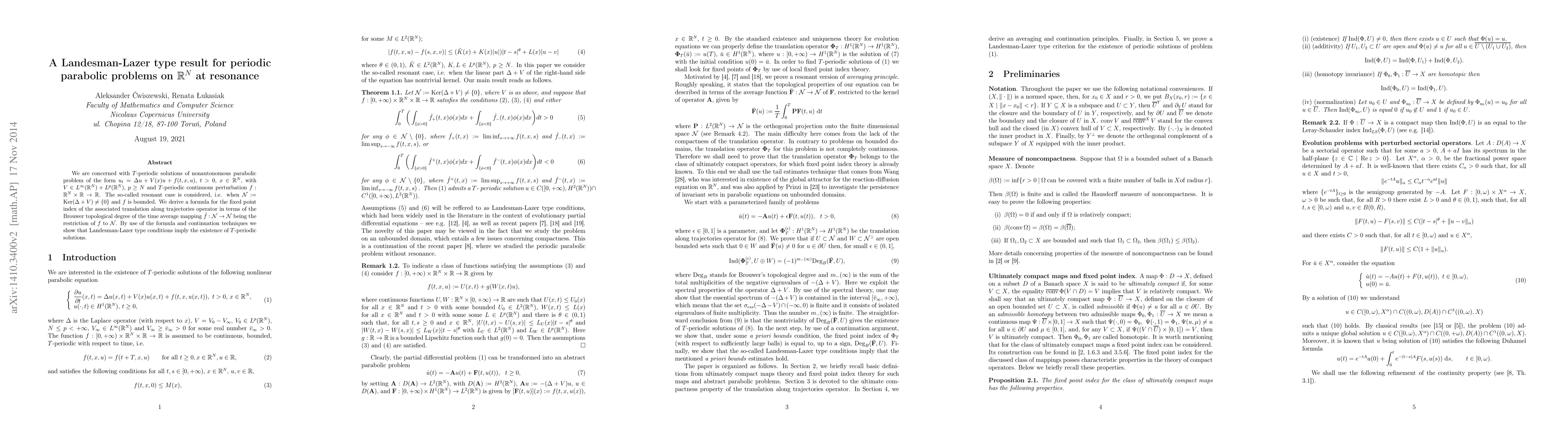 We are concerned with $T$-periodic solutions of nonautonomous parabolic problem of the form $u_t = \Delta u + V(x) u + f(t,x,u)$, $t >0$, $x \in \mathbb{R}^N$, with $V \in L^\infty (\mathbb{R}^N)+L^p(\mathbb{R}^N)$, $p \geq N$ and $T$-periodic continuous perturbation $f:\mathbb{R}^N\times \mathbb{R} \to \mathbb{R}$. The so-called resonant case is considered, i.e. when ${\cal N}:=\mathrm{Ker} (\Delta + V) \neq \{0\}$ and $f$ is bounded by a square-integrable function. We derive a formula for the fixed point index of the associated translation along trajectories operator in terms of the Brouwer topological degree of the time average mapping $\hat f: {\cal N}\to {\cal N}$ being the restriction of $f$ to ${\cal N}$. By use of the formula and continuation techniques we show that Landesman-Lazer type conditions imply the existence of $T$-periodic solutions.