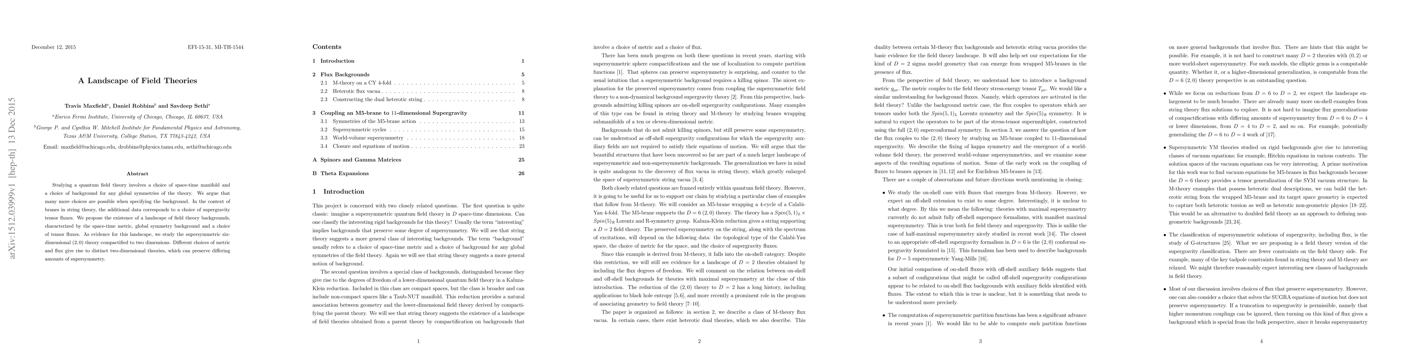 This paper proposes the existence of a landscape of field theory backgrounds defined by space-time metrics, global symmetry backgrounds, and tensor fluxes, particularly in the context of branes in string theory. Evidence is provided through the study of a supersymmetric six-dimensional (2,0) theory compactified to two dimensions, showing distinct two-dimensional theories with varying degrees of supersymmetry.