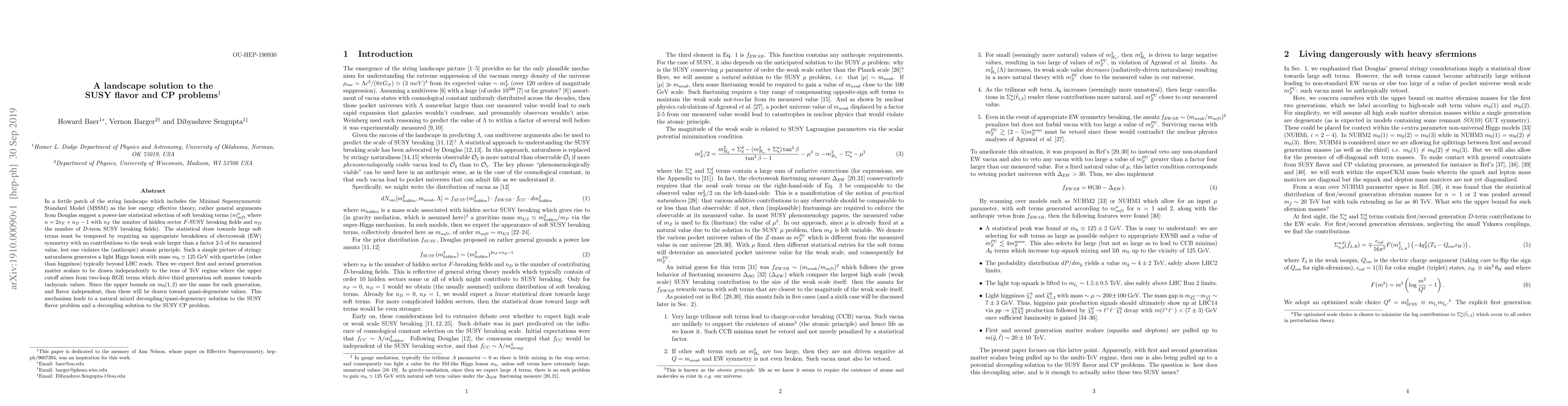 This paper proposes a string landscape solution to the SUSY flavor and CP problems by suggesting a power-law selection of large soft breaking terms, leading to quasi-degenerate second and first generation sparticles and a decoupling solution for CP violation, while maintaining a light Higgs boson and sparticles beyond LHC reach.