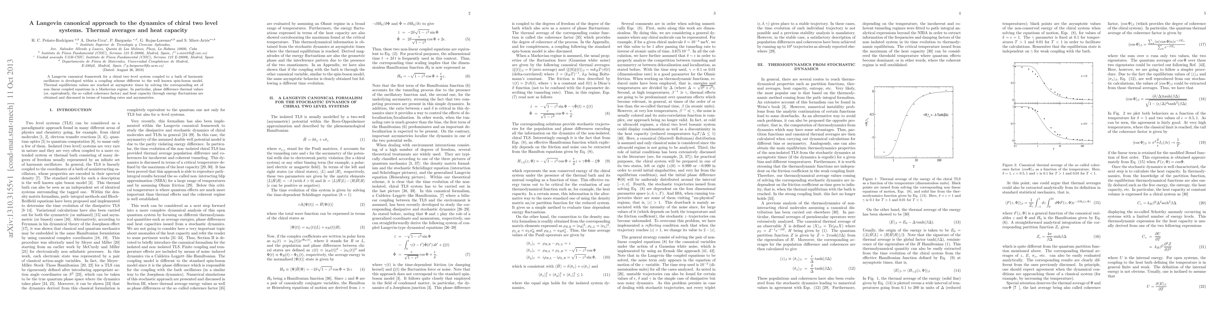 A Langevin canonical framework for a chiral two--level system coupled to a bath of harmonic oscillators is developed within a coupling scheme different to the well known spin-boson model. Thermal equilibrium values are reached at asymptotic times by solving the corresponding set of non--linear coupled equations in a Markovian regime. In particular, phase difference thermal values (or, equivalently, the so--called coherence factor) and heat capacity through energy fluctuations are obtained and discussed in terms of tunneling rates and asymmetries.