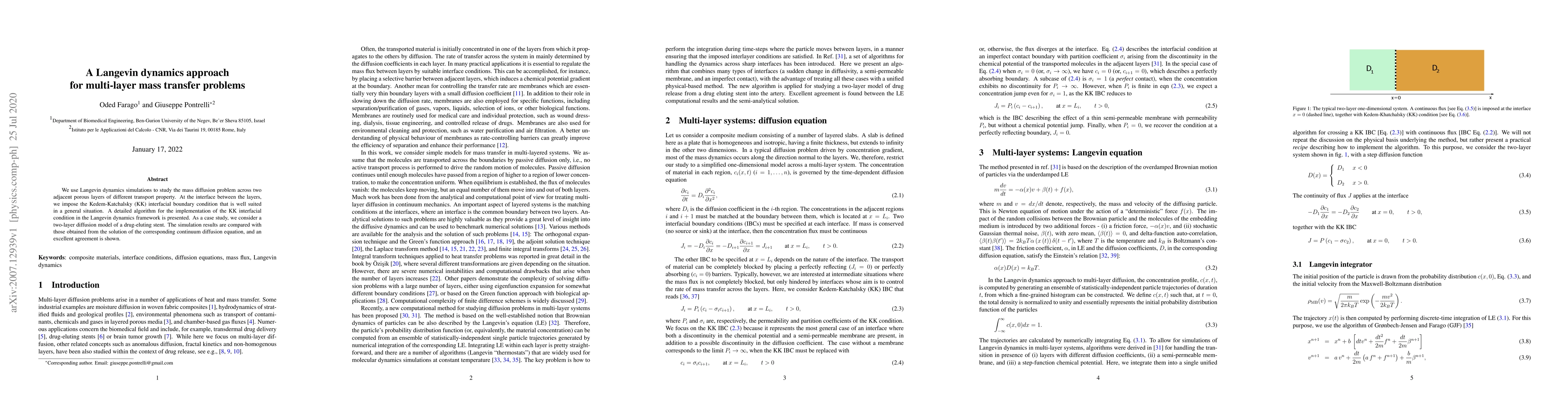 This paper employs Langevin dynamics simulations to investigate mass diffusion across two porous layers with different transport properties, using the Kedem-Katchalsky interfacial boundary condition. The study demonstrates excellent agreement between simulation results and continuum diffusion equation solutions, exemplified by a drug-eluting stent model.