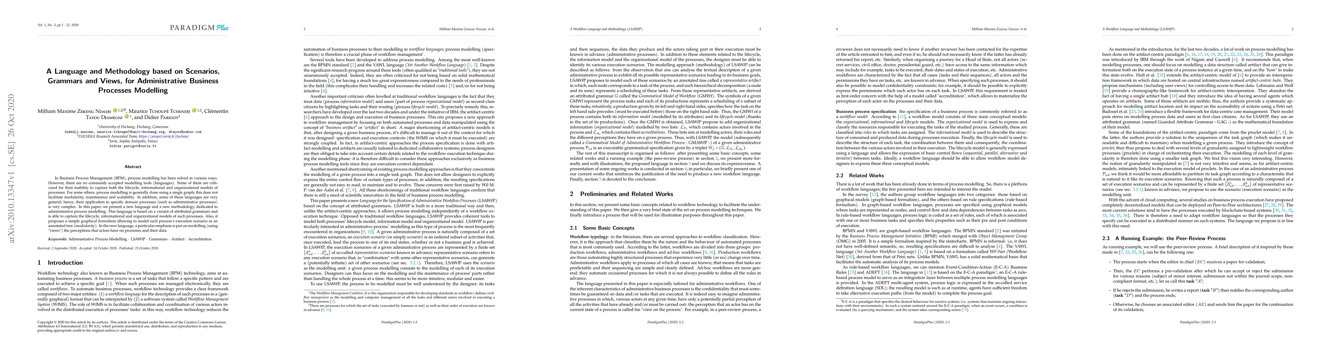 In Business Process Management (BPM), process modelling has been solved in various ways. However, there are no commonly accepted modelling tools (languages). Some of them are criticized for their inability to capture both the lifecycle, informational and organizational models of processes. For some others, process modelling is generally done using a single graph; this does not facilitate modularity, maintenance and scalability. In addition, some of these languages are very general; hence, their application to specific domain processes (such as administrative processes) is very complex. In this paper, we present a new language and a new methodology, dedicated to administrative process modelling. This language is based on a variant of attributed grammars and is able to capture the lifecycle, informational and organizational models of such processes. Also, it proposes a simple graphical formalism allowing to model each process's execution scenario as an annotated tree (modularity). In the new language, a particular emphasis is put on modelling (using "views") the perceptions that actors have on processes and their data.