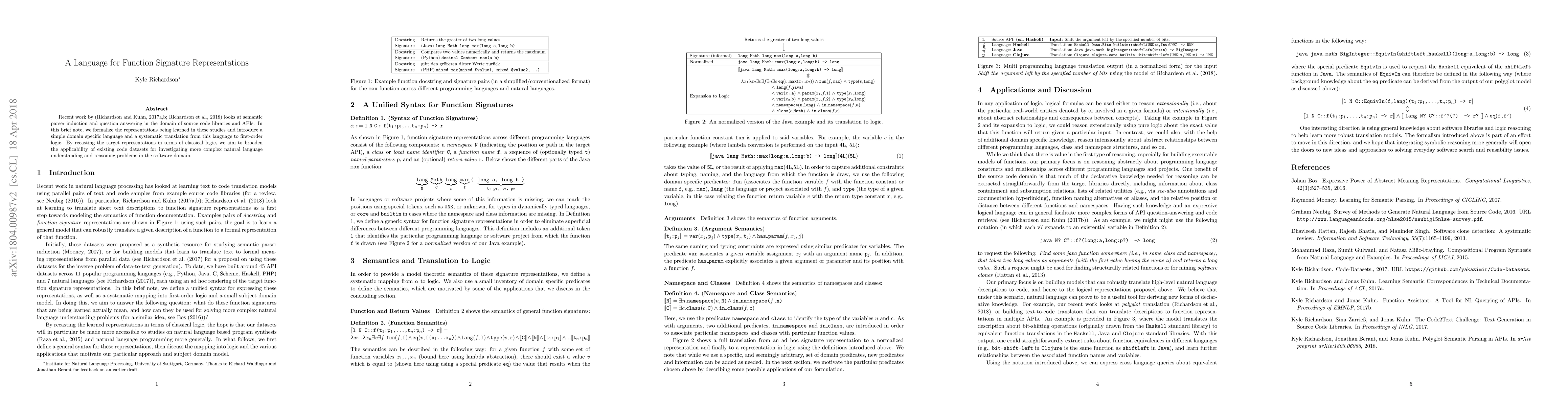 This paper introduces a domain-specific language for representing function signatures in source code, translating them into first-order logic. The aim is to leverage existing code datasets for more intricate natural language understanding and reasoning tasks within the software domain.