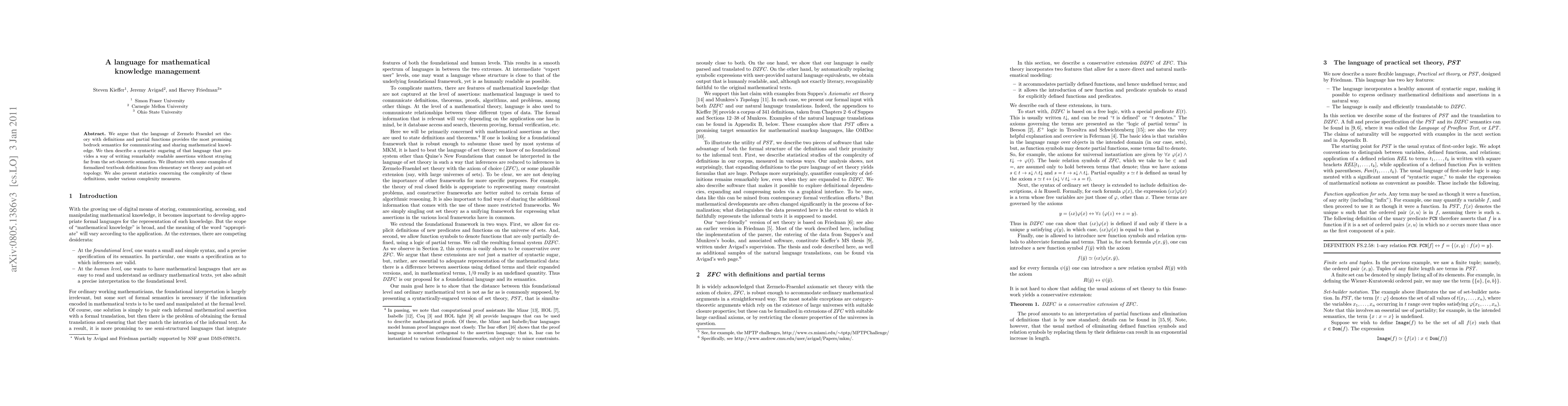 We argue that the language of Zermelo Fraenkel set theory with definitions and partial functions provides the most promising bedrock semantics for communicating and sharing mathematical knowledge. We then describe a syntactic sugaring of that language that provides a way of writing remarkably readable assertions without straying far from the set-theoretic semantics. We illustrate with some examples of formalized textbook definitions from elementary set theory and point-set topology. We also present statistics concerning the complexity of these definitions, under various complexity measures.
