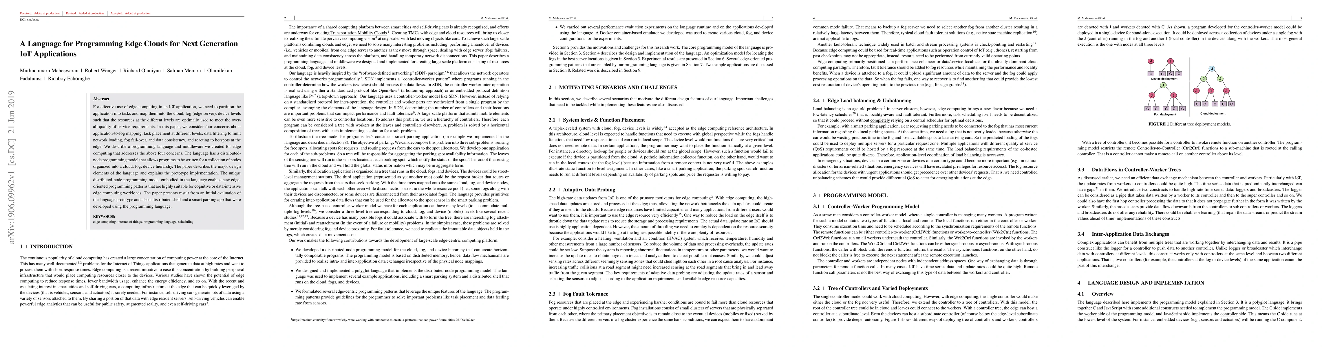 For effective use of edge computing in an IoT application, we need to partition the application into tasks and map them into the cloud, fog (edge server), device levels such that the resources at the different levels are optimally used to meet the overall quality of service requirements. In this paper, we consider four concerns about application-to-fog mapping: task placement at different levels, data filtering to limit network loading, fog fail-over, and data consistency, and reacting to hotspots at the edge. We describe a programming language and middleware we created for edge computing that addresses the above four concerns. The language has a distributed-node programming model that allows programs to be written for a collection of nodes organized into a cloud, fog, device hierarchy. The paper describes the major design elements of the language and explains the prototype implementation. The unique distributed-node programming model embodied in the language enables new edge-oriented programming patterns that are highly suitable for cognitive or data-intensive edge computing workloads. The paper presents result from an initial evaluation of the language prototype and also a distributed shell and a smart parking app that were developed using the programming language.