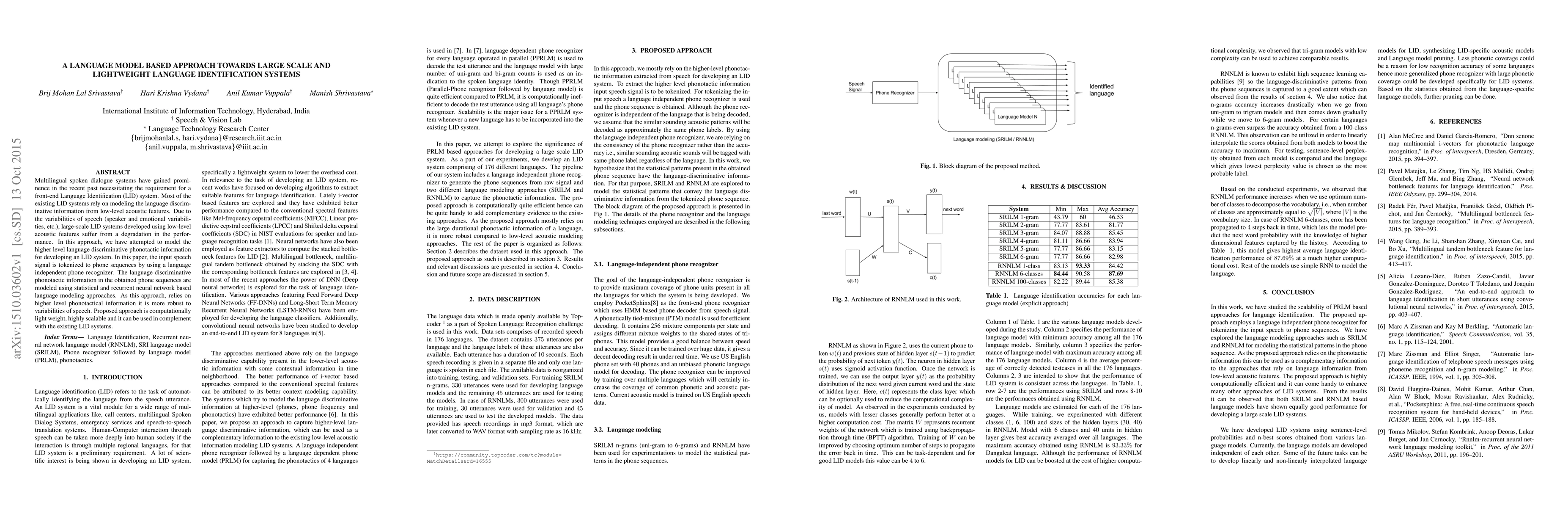 Multilingual spoken dialogue systems have gained prominence in the recent past necessitating the requirement for a front-end Language Identification (LID) system. Most of the existing LID systems rely on modeling the language discriminative information from low-level acoustic features. Due to the variabilities of speech (speaker and emotional variabilities, etc.), large-scale LID systems developed using low-level acoustic features suffer from a degradation in the performance. In this approach, we have attempted to model the higher level language discriminative phonotactic information for developing an LID system. In this paper, the input speech signal is tokenized to phone sequences by using a language independent phone recognizer. The language discriminative phonotactic information in the obtained phone sequences are modeled using statistical and recurrent neural network based language modeling approaches. As this approach, relies on higher level phonotactical information it is more robust to variabilities of speech. Proposed approach is computationally light weight, highly scalable and it can be used in complement with the existing LID systems.