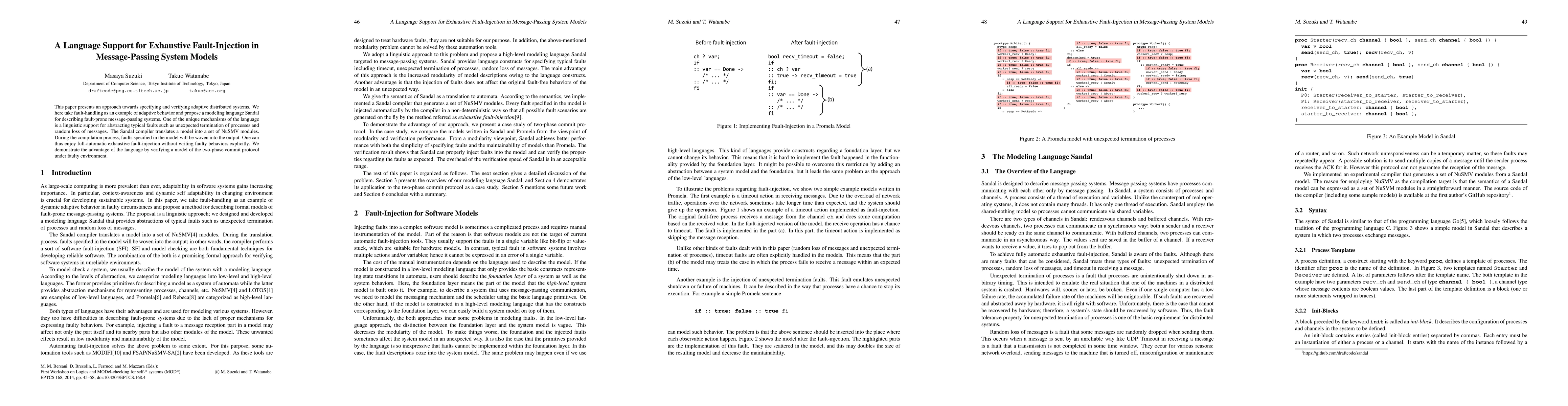 This paper presents an approach towards specifying and verifying adaptive distributed systems. We here take fault-handling as an example of adaptive behavior and propose a modeling language Sandal for describing fault-prone message-passing systems. One of the unique mechanisms of the language is a linguistic support for abstracting typical faults such as unexpected termination of processes and random loss of messages. The Sandal compiler translates a model into a set of NuSMV modules. During the compilation process, faults specified in the model will be woven into the output. One can thus enjoy full-automatic exhaustive fault-injection without writing faulty behaviors explicitly. We demonstrate the advantage of the language by verifying a model of the two-phase commit protocol under faulty environment.