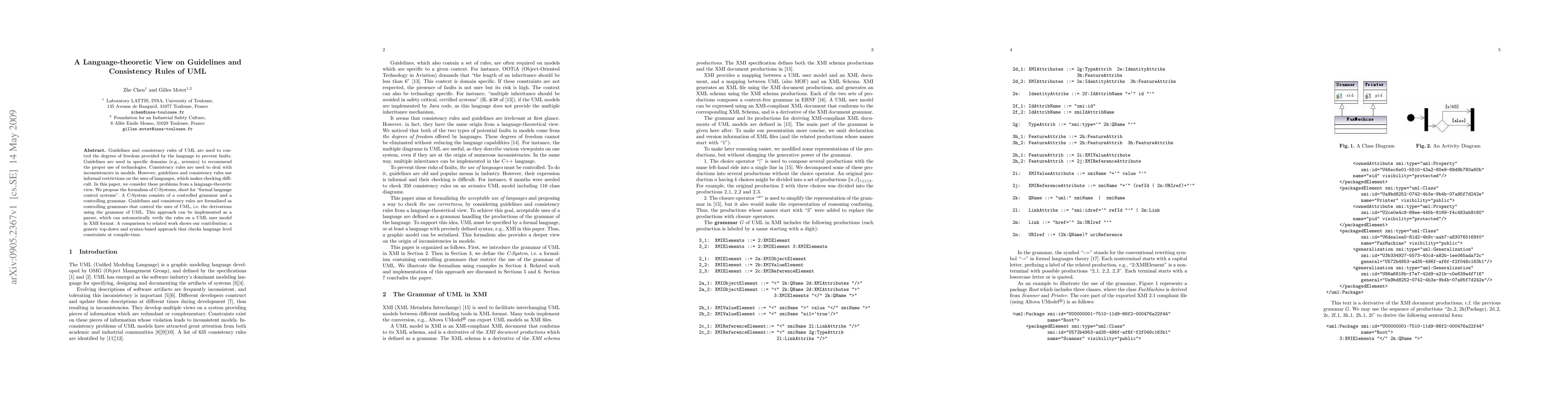 This paper proposes a language-theoretic approach to formalize UML guidelines and consistency rules using C-Systems, consisting of controlled and controlling grammars, enabling automatic verification of UML models. The method offers a generic, syntax-based, compile-time solution for checking language constraints.