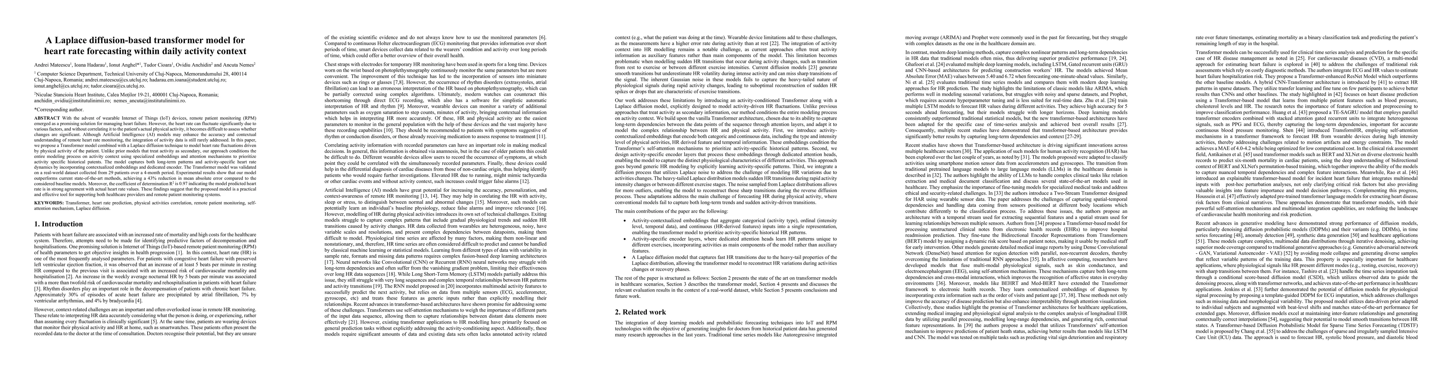With the advent of wearable Internet of Things (IoT) devices, remote patient monitoring (RPM) emerged as a promising solution for managing heart failure. However, the heart rate can fluctuate significantly due to various factors, and without correlating it to the patient's actual physical activity, it becomes difficult to assess whether changes are significant. Although Artificial Intelligence (AI) models may enhance the accuracy and contextual understanding of remote heart rate monitoring, the integration of activity data is still rarely addressed. In this paper, we propose a Transformer model combined with a Laplace diffusion technique to model heart rate fluctuations driven by physical activity of the patient. Unlike prior models that treat activity as secondary, our approach conditions the entire modeling process on activity context using specialized embeddings and attention mechanisms to prioritize activity specific historical patents. The model captures both long-term patterns and activity-specific heart rate dynamics by incorporating contextualized embeddings and dedicated encoder. The Transformer model was validated on a real-world dataset collected from 29 patients over a 4-month period. Experimental results show that our model outperforms current state-of-the-art methods, achieving a 43% reduction in mean absolute error compared to the considered baseline models. Moreover, the coefficient of determination R2 is 0.97 indicating the model predicted heart rate is in strong agreement with actual heart rate values. These findings suggest that the proposed model is a practical and effective tool for supporting both healthcare providers and remote patient monitoring systems.